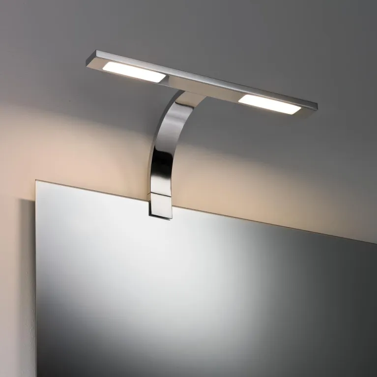 Удобная конструкция светильника позволяет легко монтировать его на стену рядом с зеркалом, обеспечивая надежное крепление и простоту установки. Компактные размеры и универсальный дизайн подсветки идеально подходят для интерьеров в стиле минимализм, хай-тек или модерн.
