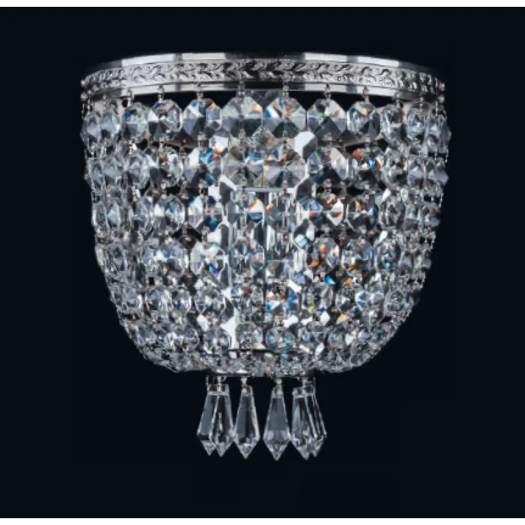 Бра оснащено одним плафоном из прозрачного хрусталя, который эффектно преломляет свет, создавая неповторимую игру света и тени. Основание выполнено из никелированного металла, что придаёт светильнику современный и стильный вид.