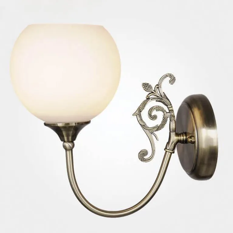 Корпус бра выполнен из прочного металла с эффектным покрытием цвета античной бронзы, которое придаёт изделию изысканный и утончённый вид. Плафон из матового стекла обеспечивает равномерное рассеивание света, создавая комфортное освещение в помещении.