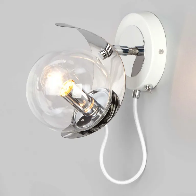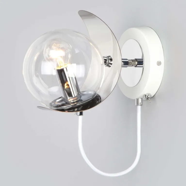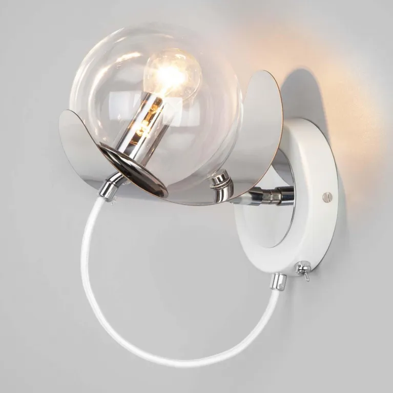 Корпус бра выполнен из прочного металла с белым покрытием, которое придаёт изделию свежий и современный вид. Плафон из матового стекла обеспечивает мягкое и равномерное рассеивание света, создавая уютную атмосферу в помещении.