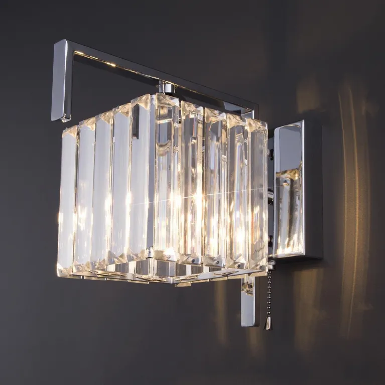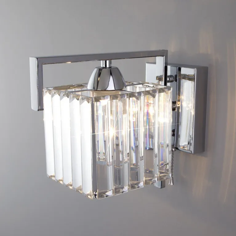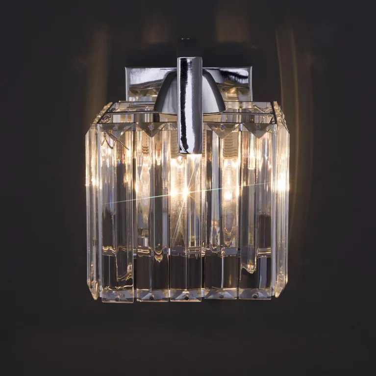 Корпус бра выполнен из прочного металла с хромированным покрытием, которое придаёт изделию современный и стильный вид. Прозрачные хрустальные элементы плафона добавляют света и блеска, создавая утонченную атмосферу в помещении.