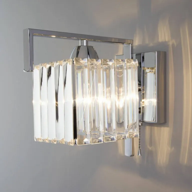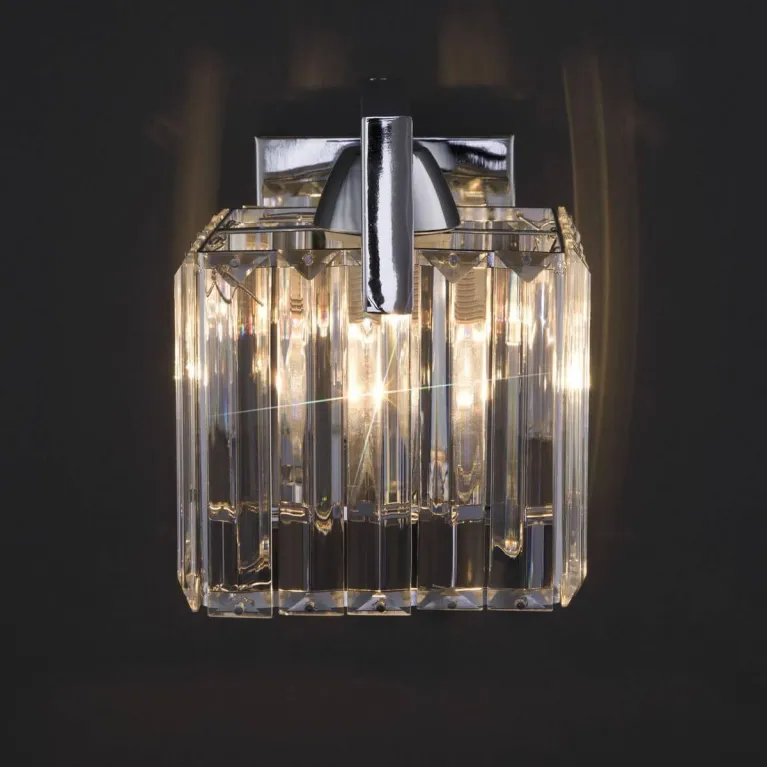 Корпус бра выполнен из прочного металла с хромированным покрытием, которое придаёт изделию современный и стильный вид. Прозрачные хрустальные элементы плафона добавляют света изящества и утонченности, создавая неповторимую атмосферу уюта и гармонии.