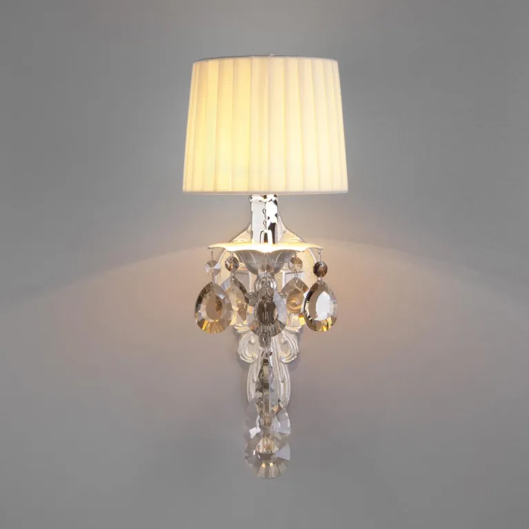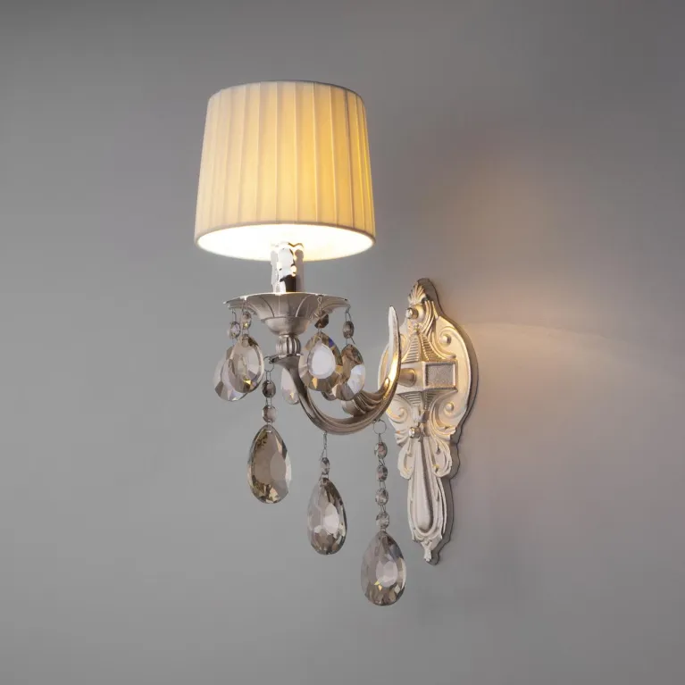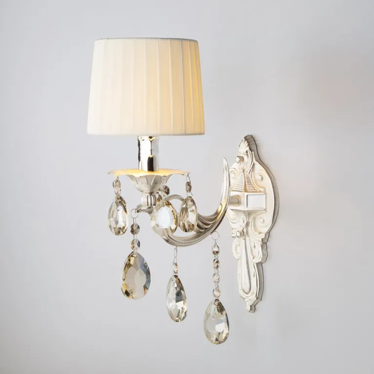Корпус бра выполнен из прочного металла с серебристым тонированием, что придаёт изделию современный и стильный вид. Плафон из тончайшего хрусталя строцци добавляет светильнику лёгкости и изящества, обеспечивая мягкое и равномерное рассеивание света.