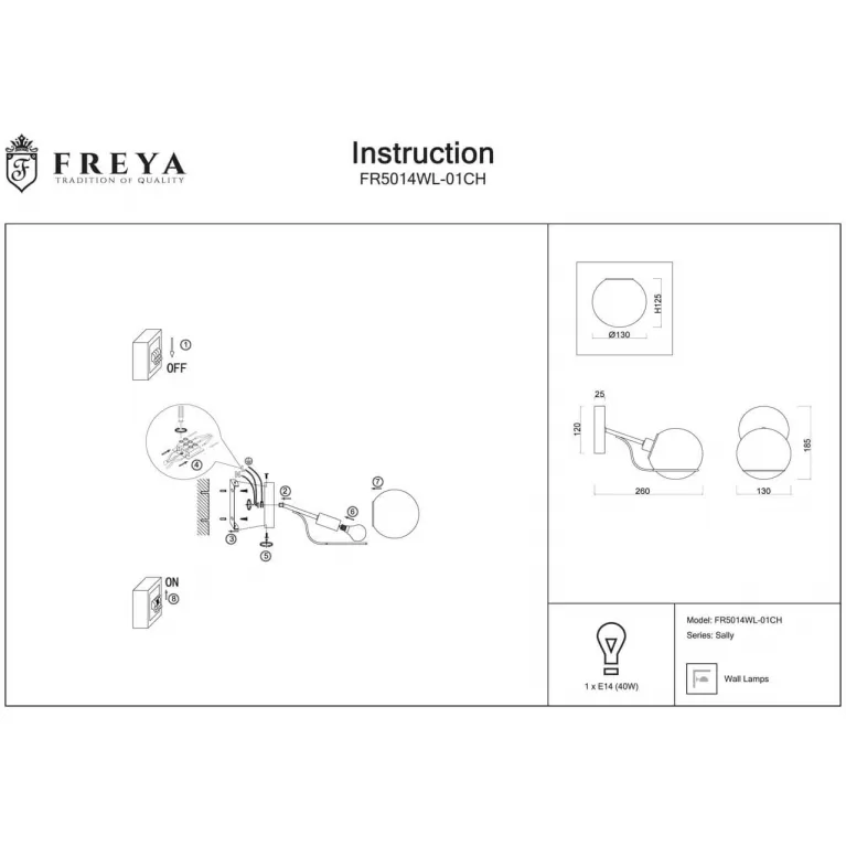 Бра Freya Sally оснащено одним источником света с цоколем E14, что позволяет использовать как традиционные лампы накаливания, так и энергосберегающие или светодиодные лампы, в зависимости от ваших предпочтений и потребностей.