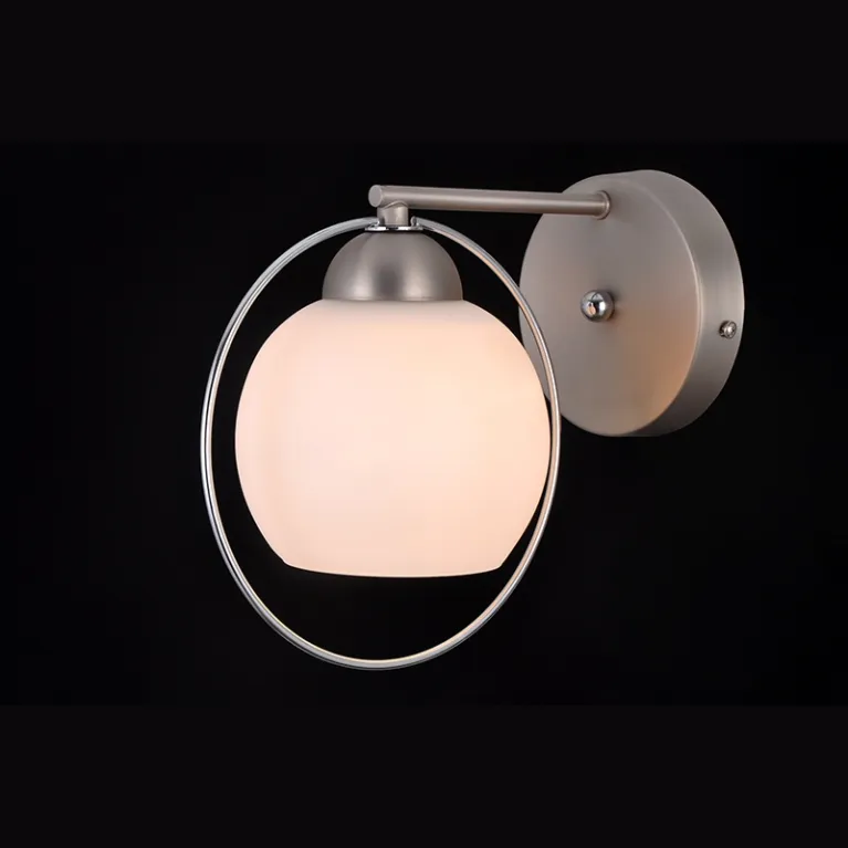 Корпус бра выполнен из прочного металла с никелевым покрытием, придающим изделию элегантный сатиновый никель. Плафон из белого матового стекла обеспечивает мягкое и равномерное рассеивание света, создавая комфортное освещение в помещении.