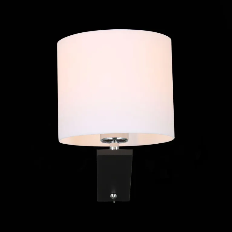 Бра оснащено одним плафоном из белого матового стекла, который обеспечивает равномерное распределение света и создаёт приятную атмосферу в помещении. Основание выполнено из прочного металла с черным покрытием, что придаёт светильнику современный и лаконичный вид.