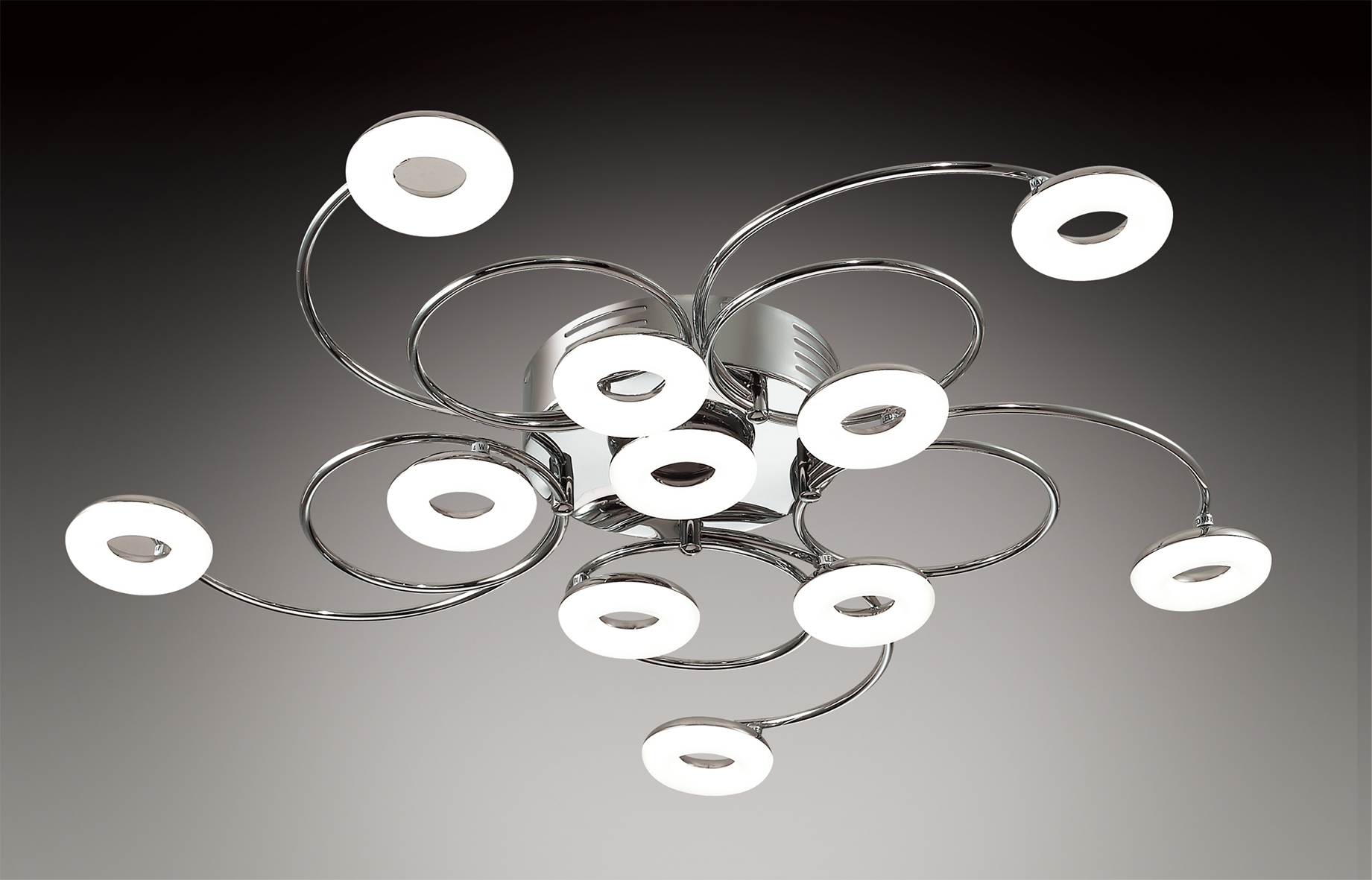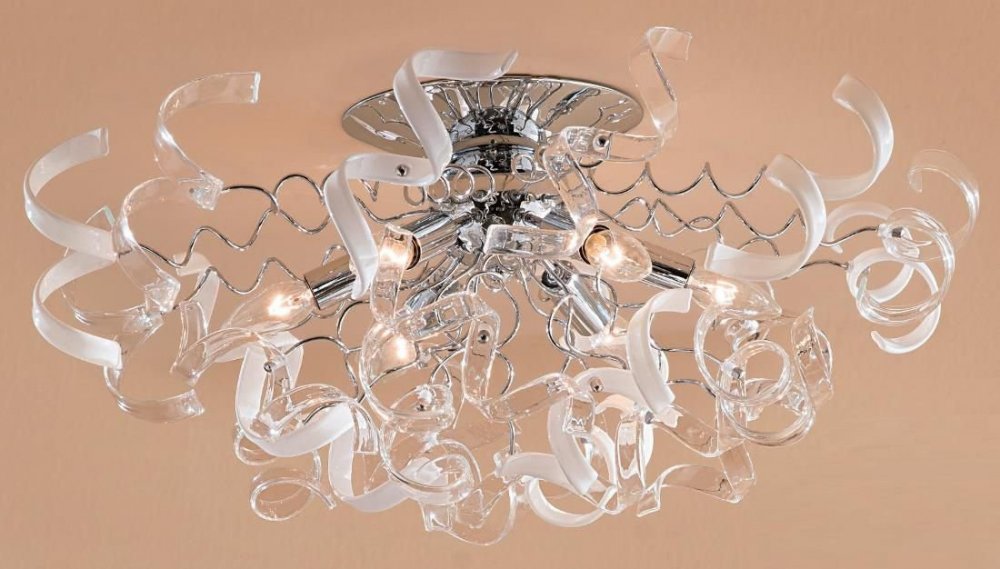 Длина шнура у разных моделей отличается, обычно по желанию хозяев она поддаётся регулировке. Изготавливаются из разных материалов: металл и текстиль, хрусталь и стекло, дерево и бумага и т.д. Они выполняются в разных стилях и формах.Подвесные модели бывают одноплафонными, либо представляют собой каркас, к которому крепятся светильники. Интересен вариант с гроздьями из 5-6-ти плафонов, подвешенных к основанию на шнурах.Если длины этих струн одинаковы, то получается классическая световая композиция. Разноразмерные же подвесы создают причудливые многоуровневые арт-объекты.Подвесные светильники различаются направленностью плафонов. Предпочтителен вариант, когда светильники «смотрят» вверх – такое положение даёт комфортное для глаз светорассеивание.Если же поверхность потолка отличается зеркальной глянцевитостью, лучше выбрать прибор с направленными вниз плафонами. Альтернативная идея – приобретение люстры с регулируемыми светильниками на спотах, которые можно легко поворачивать в стороны.Другой тип конструкции – прикрепляемый к потолку с помощью планки приповерхностный светильник. Это вариант для комнат с невысокими потолками.Чаще такие изделия выполняются в виде тарелки. Они могут быть многосегментарными или представлять собой цельную конструкцию. Плафоны осветительных приборов этого типа обычно изготавливаются из стекла или пластика. Чем прозрачнее материал – тем больше света пропускает прибор.Для усиления осветительной функции модели оснащают зеркальными отражателями. Под плафоном – один или несколько источников освещения. Недостаток потолочных светильников – для замены перегоревшей лампочки приходится снимать плафон.