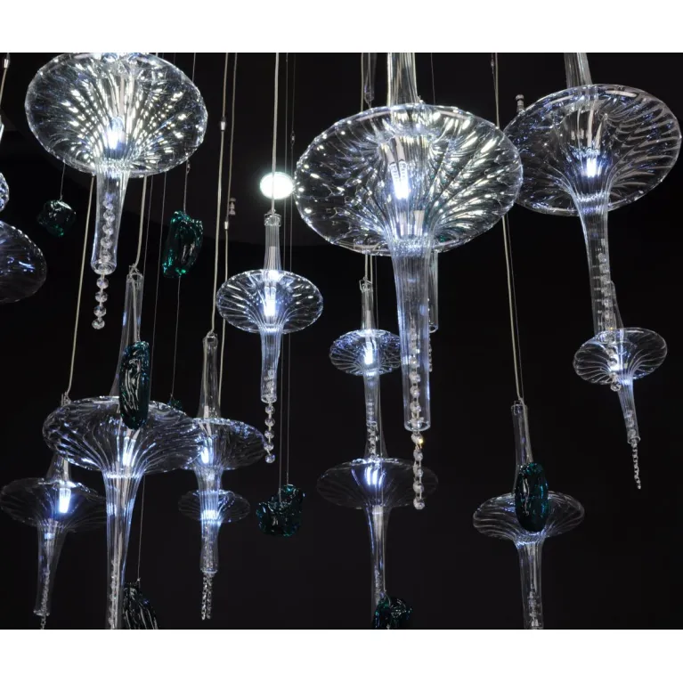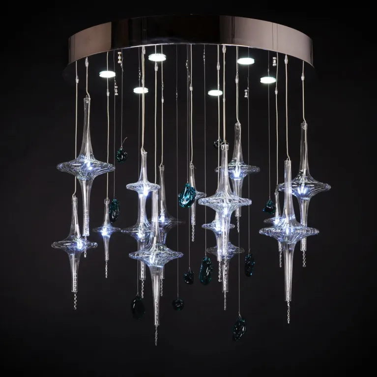 Преобладающий цвет плафонов: Прозрачный, арматуры: Хром; материал изготовления арматуры: Металл, размеры, мм: / высота 830 / диаметр 800. Общая мощность – 800 Ватт, а максимальная площадь освещения до 25 м2. Основной тип ламп, предусмотренный производителем: Галогеновая с цоколем G4. В зависимости от предпочтений можно использовать лампы теплового, холодного или нейтрального света, за исключением люстр с типом цоколя LED.
