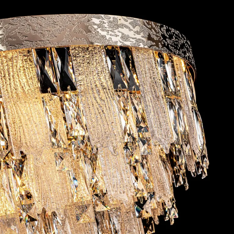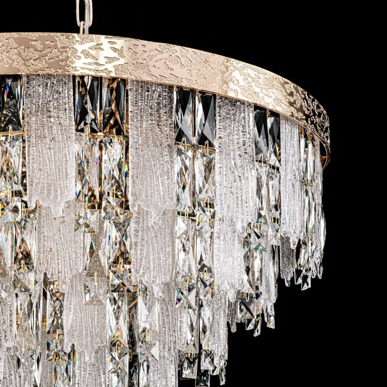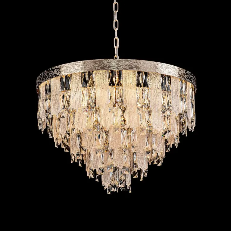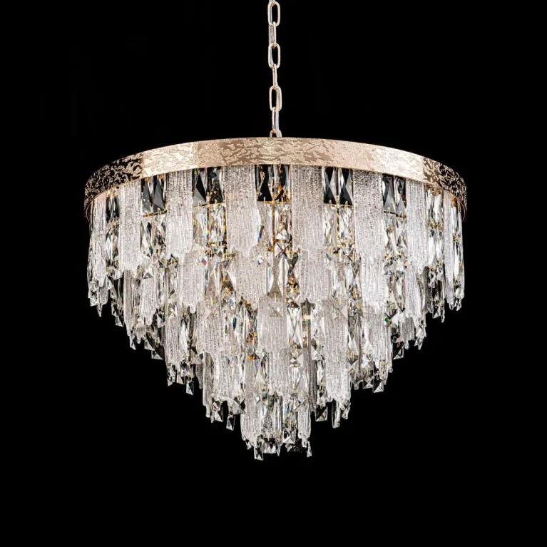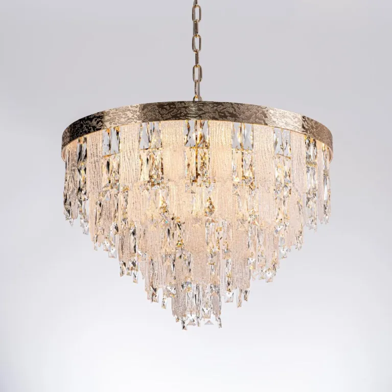 Преобладающий цвет плафонов: Прозрачный, арматуры: Золото; материал изготовления арматуры: Металл, размеры, мм: / высота 1200 / диаметр 600. Общая мощность – 520 Ватт, а максимальная площадь освещения до 17 м2. Основной тип ламп, предусмотренный производителем: Накаливания с цоколем E14. В зависимости от предпочтений можно использовать лампы теплового, холодного или нейтрального света, за исключением люстр с типом цоколя LED.