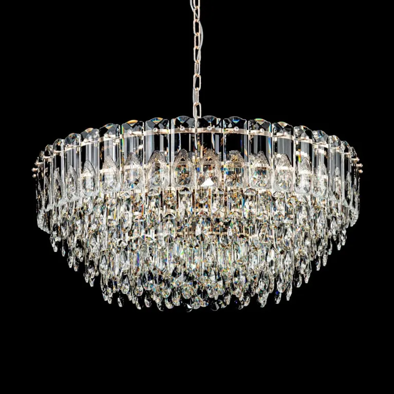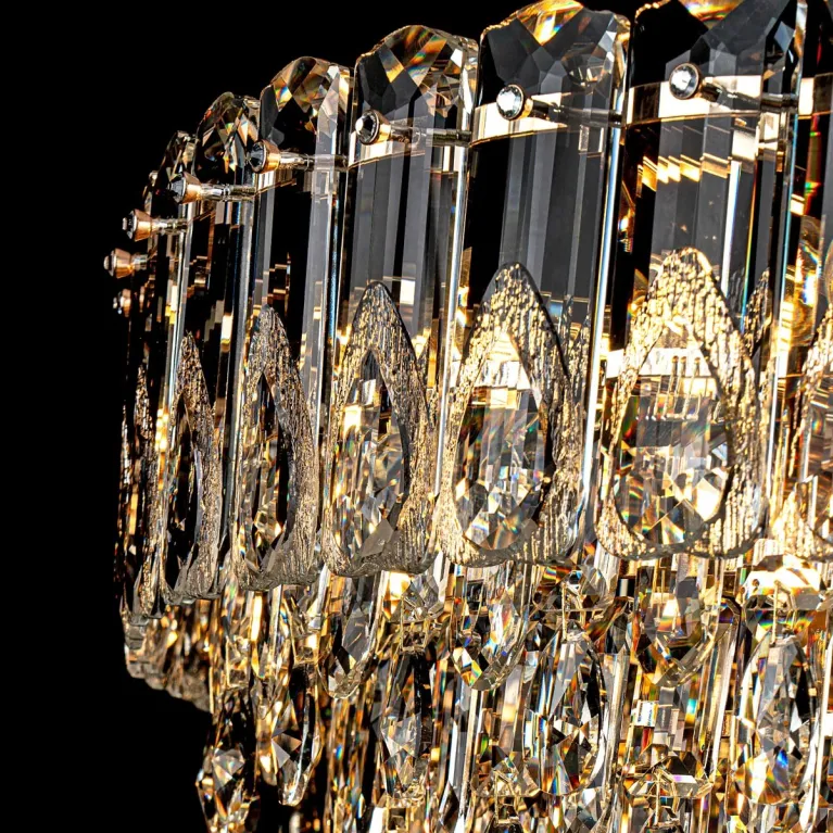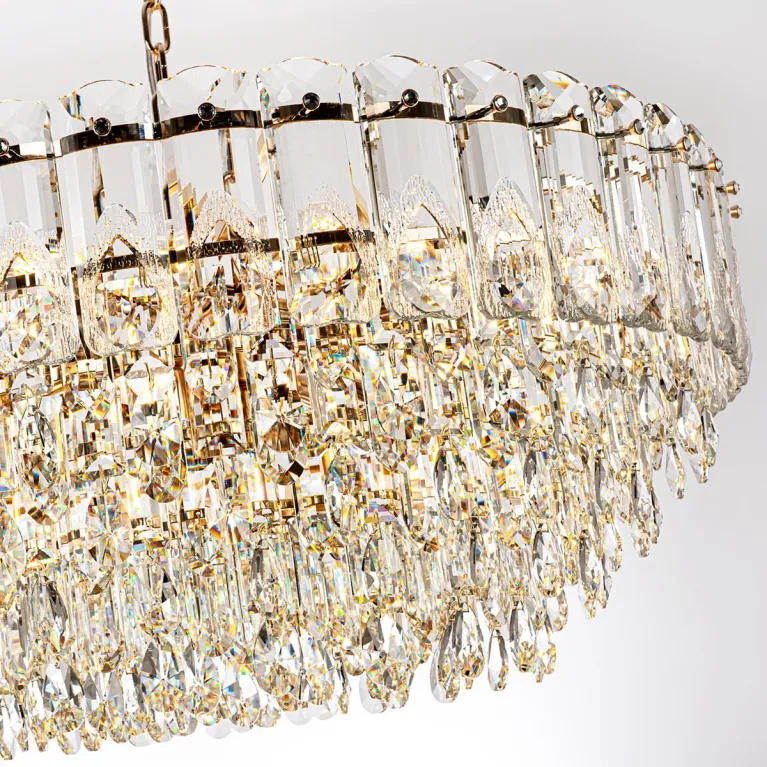 Преобладающий цвет плафонов: Прозрачный, арматуры: Золото; материал изготовления арматуры: Металл, размеры, мм: / высота 1200 / диаметр 800. Общая мощность – 880 Ватт, а максимальная площадь освещения до 20 м2. Основной тип ламп, предусмотренный производителем: Накаливания с цоколем E14. В зависимости от предпочтений можно использовать лампы теплового, холодного или нейтрального света, за исключением люстр с типом цоколя LED.