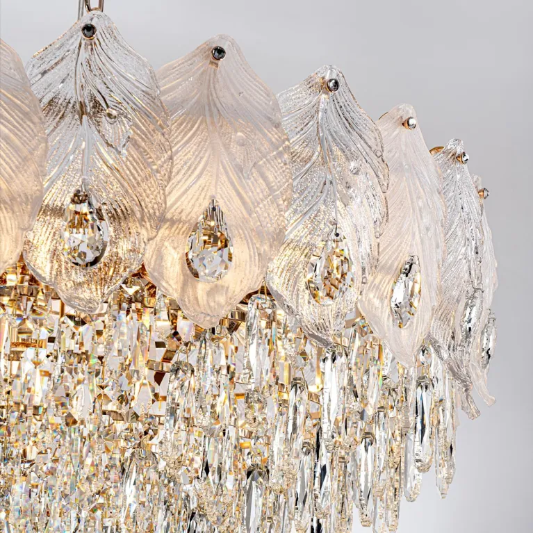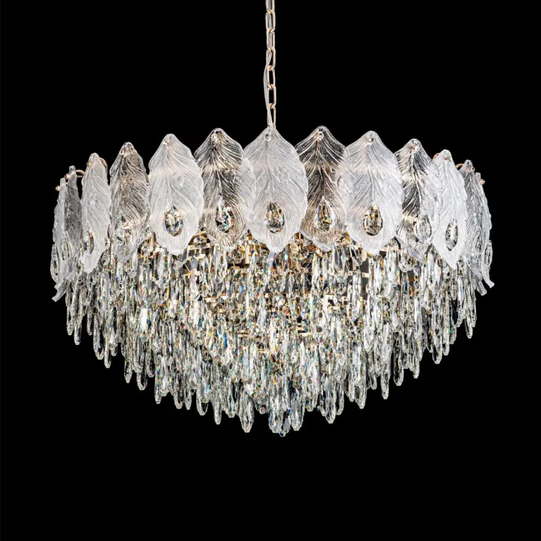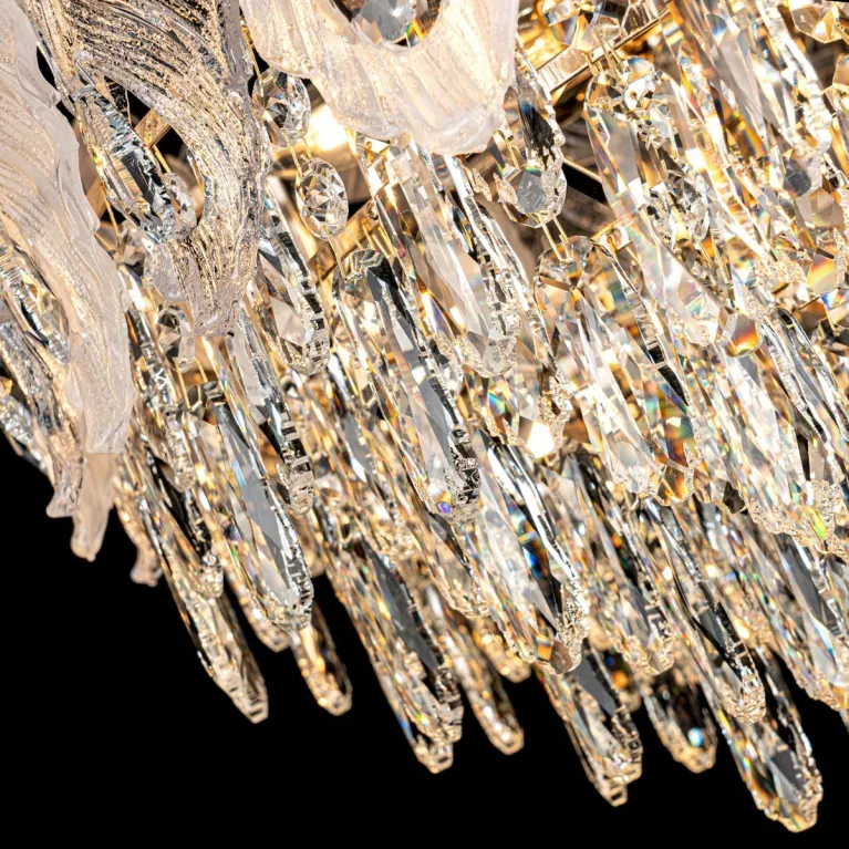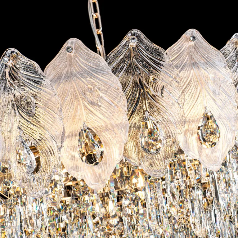 Преобладающий цвет плафонов: Прозрачный, арматуры: Золото; материал изготовления арматуры: Металл, размеры, мм: / высота 1200 / диаметр 800. Общая мощность – 800 Ватт, а максимальная площадь освещения до 20 м2. Основной тип ламп, предусмотренный производителем: Накаливания с цоколем E14. В зависимости от предпочтений можно использовать лампы теплового, холодного или нейтрального света, за исключением люстр с типом цоколя LED.