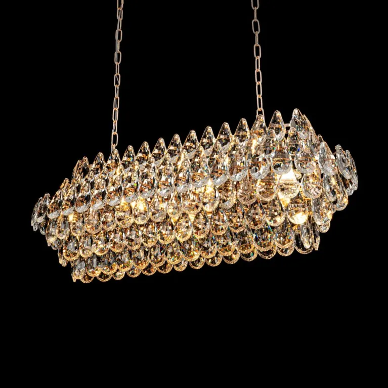 Преобладающий цвет плафонов: Прозрачный, арматуры: Золото; материал изготовления арматуры: Металл, размеры, мм: длина 1050 / ширина 370 / высота 950 Общая мощность – 680 Ватт, а максимальная площадь освещения до 20 м2. Основной тип ламп, предусмотренный производителем: Накаливания с цоколем E14. В зависимости от предпочтений можно использовать лампы теплового, холодного или нейтрального света, за исключением люстр с типом цоколя LED.