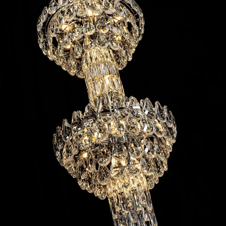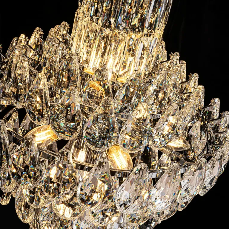 Преобладающий цвет плафонов: Прозрачный, арматуры: Хром; материал изготовления арматуры: Металл, размеры, мм: / высота 2900 / диаметр 490. Общая мощность – 1560 Ватт. Основной тип ламп, предусмотренный производителем: Накаливания с цоколем E14. В зависимости от предпочтений можно использовать лампы теплового, холодного или нейтрального света, за исключением люстр с типом цоколя LED.