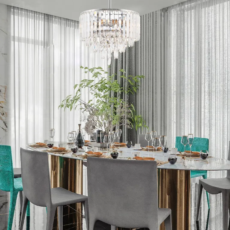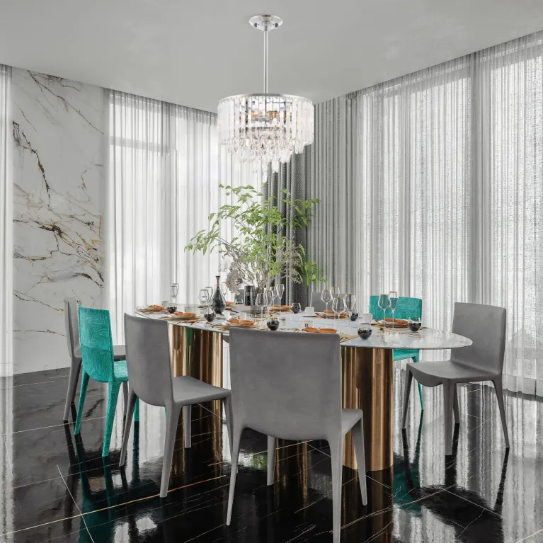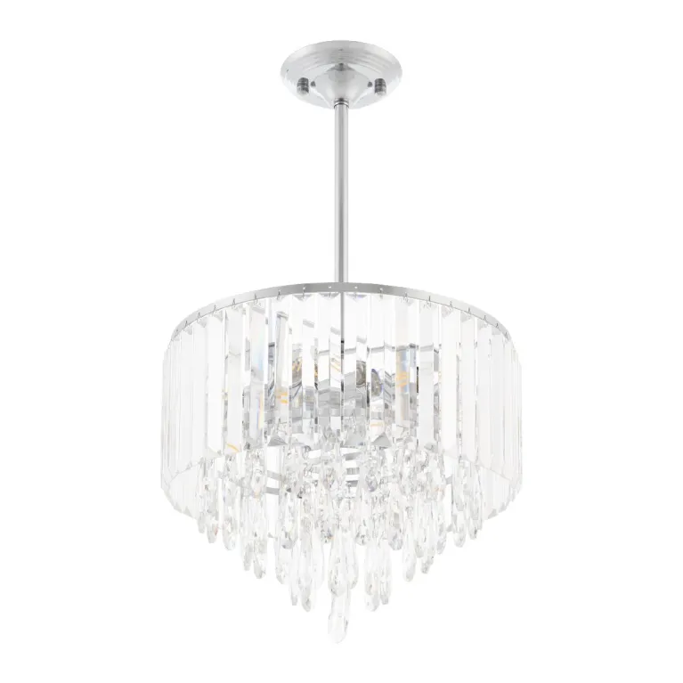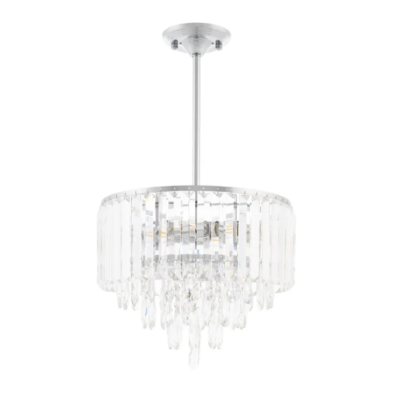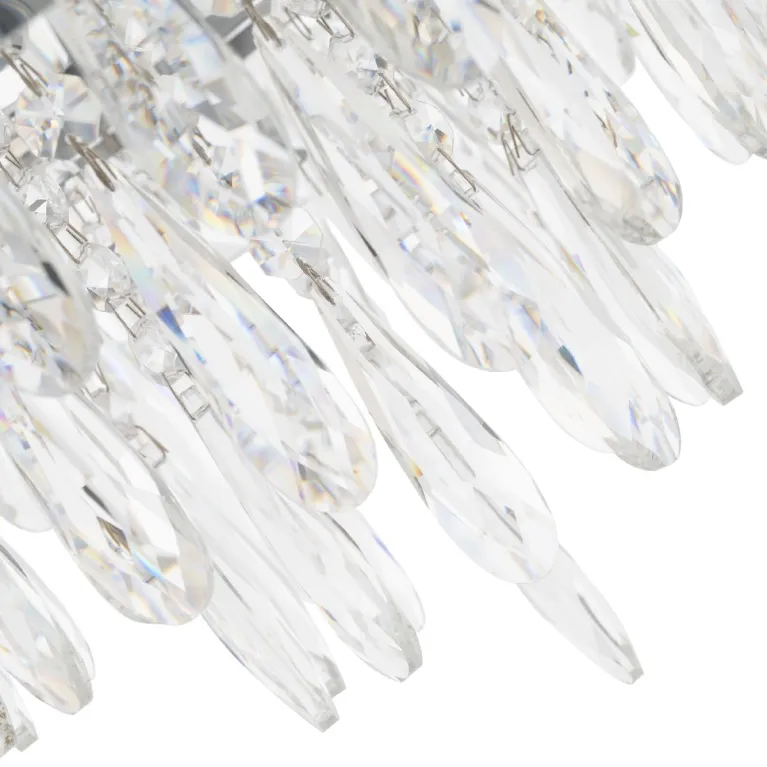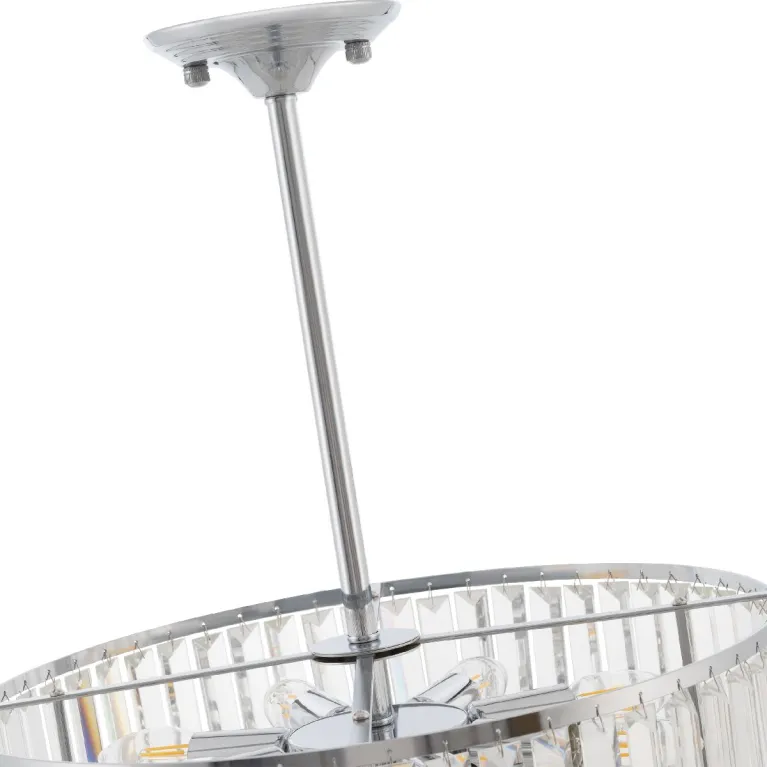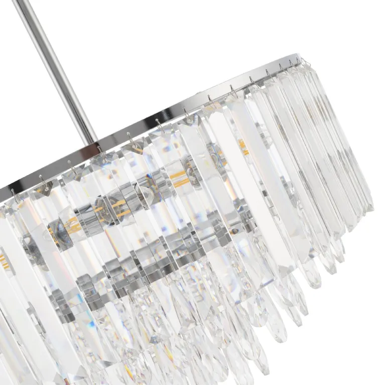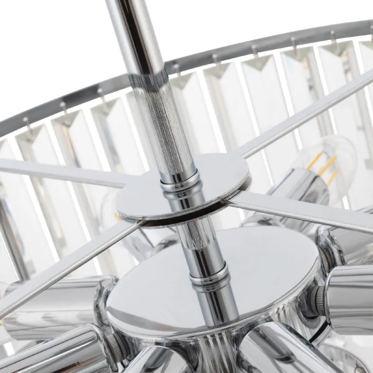 Преобладающий цвет плафонов: Прозрачный, арматуры: Хром; материал изготовления арматуры: Металл, размеры, мм: / высота 660 / диаметр 390. Общая мощность – 240 Ватт. Основной тип ламп, предусмотренный производителем: Накаливания с цоколем E14. В зависимости от предпочтений можно использовать лампы теплового, холодного или нейтрального света, за исключением люстр с типом цоколя LED.
