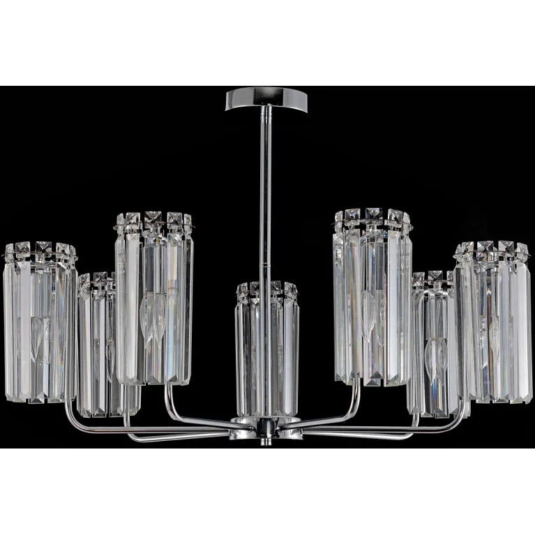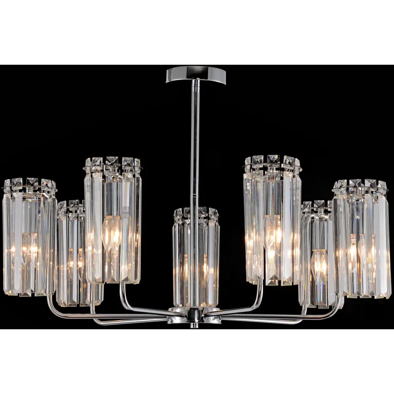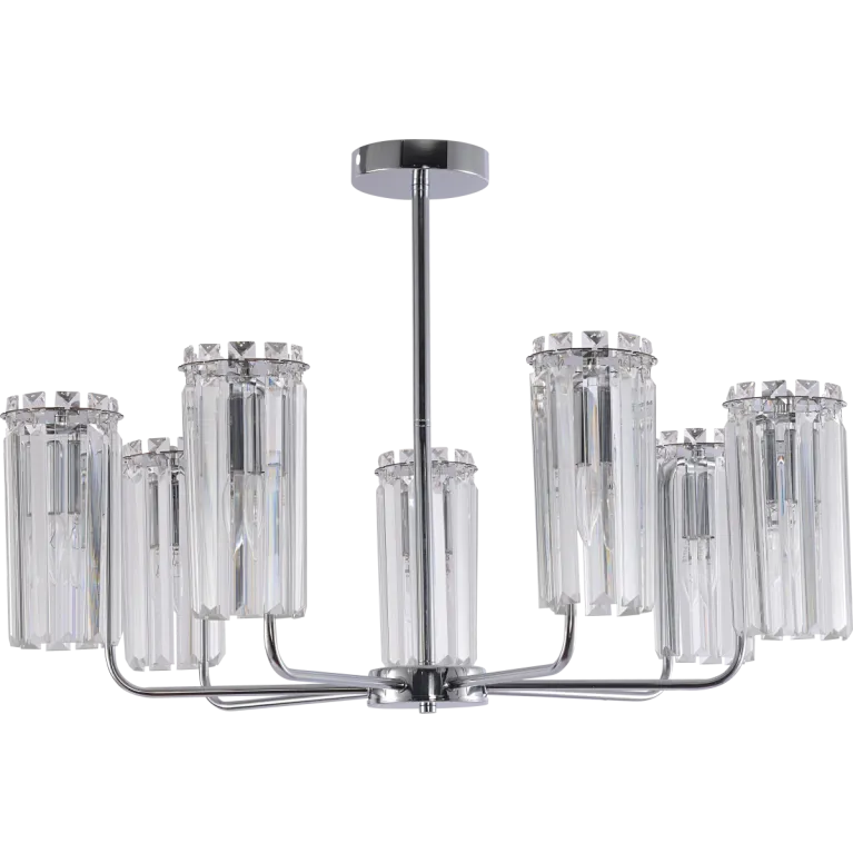 Преобладающий цвет плафонов: Прозрачный, арматуры: Хром; материал изготовления арматуры: Металл, размеры, мм: / высота 460 / диаметр 700. Общая мощность – 280 Ватт, а максимальная площадь освещения до 21 м2. Основной тип ламп, предусмотренный производителем: Накаливания с цоколем E14. В зависимости от предпочтений можно использовать лампы теплового, холодного или нейтрального света, за исключением люстр с типом цоколя LED.