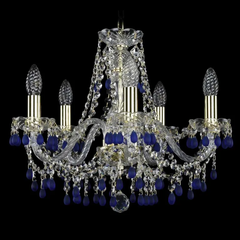 Корпус люстры выполнен из высококачественного металла и имеет гальваническое покрытие в золотом цвете, придающее изделию роскошный и утонченный вид. Стеклянные элементы изготовлены из прочного хрусталя и имеют причудливую форму, добавляя светильнику изысканности и элегантности.