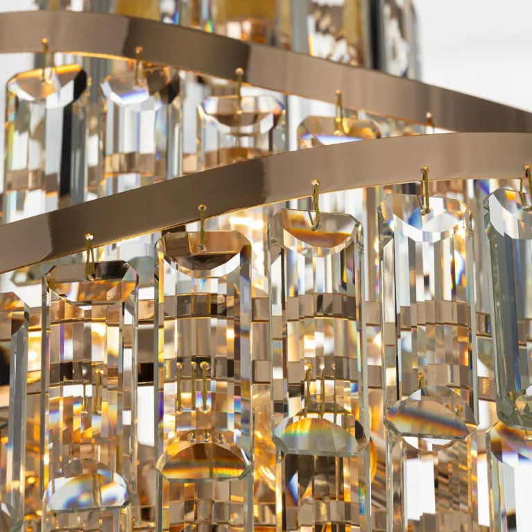 Преобладающий цвет плафонов: Прозрачный, арматуры: Золото; материал изготовления арматуры: Металл, размеры, мм: / высота 1200 / диаметр 460. Общая мощность – 320 Ватт. Основной тип ламп, предусмотренный производителем: Накаливания с цоколем E14. В зависимости от предпочтений можно использовать лампы теплового, холодного или нейтрального света, за исключением люстр с типом цоколя LED.