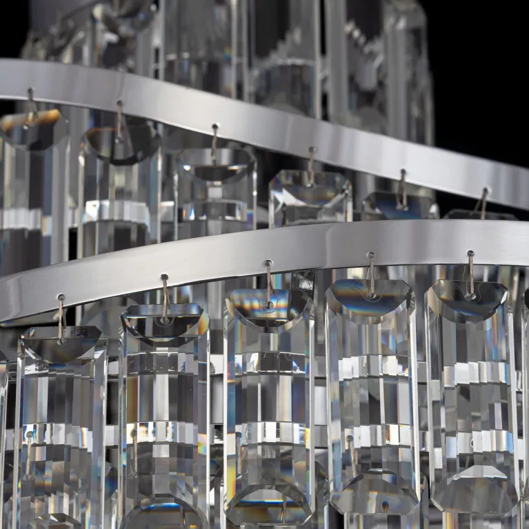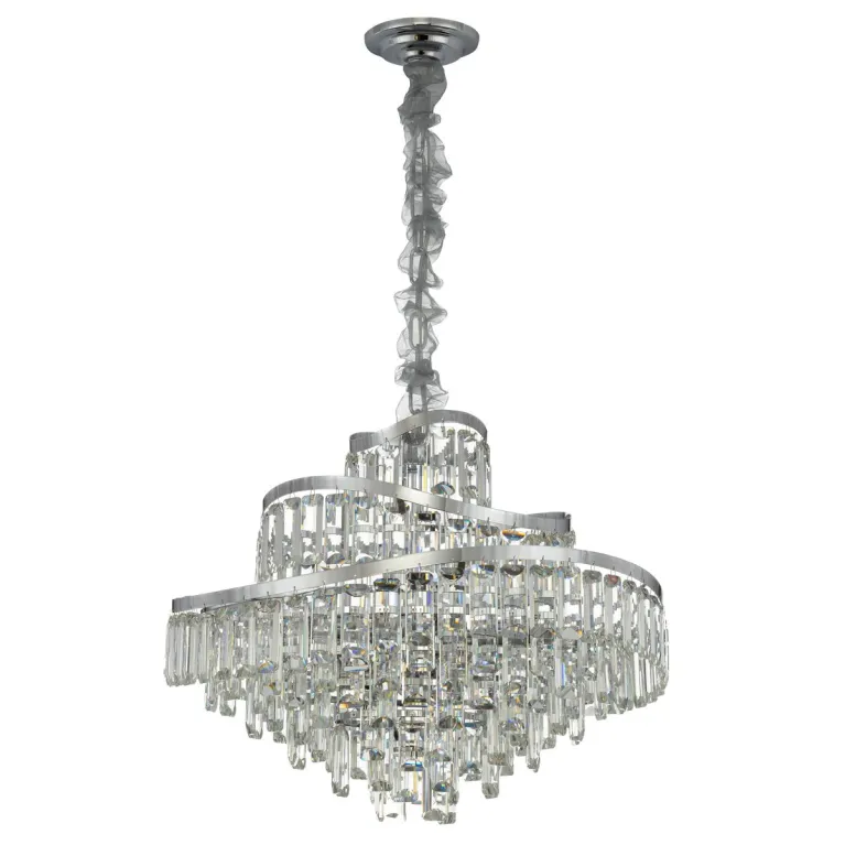 Преобладающий цвет плафонов: Прозрачный, арматуры: Хром; материал изготовления арматуры: Металл, размеры, мм: / высота 1250 / диаметр 550. Общая мощность – 480 Ватт. Основной тип ламп, предусмотренный производителем: Накаливания с цоколем E14. В зависимости от предпочтений можно использовать лампы теплового, холодного или нейтрального света, за исключением люстр с типом цоколя LED.