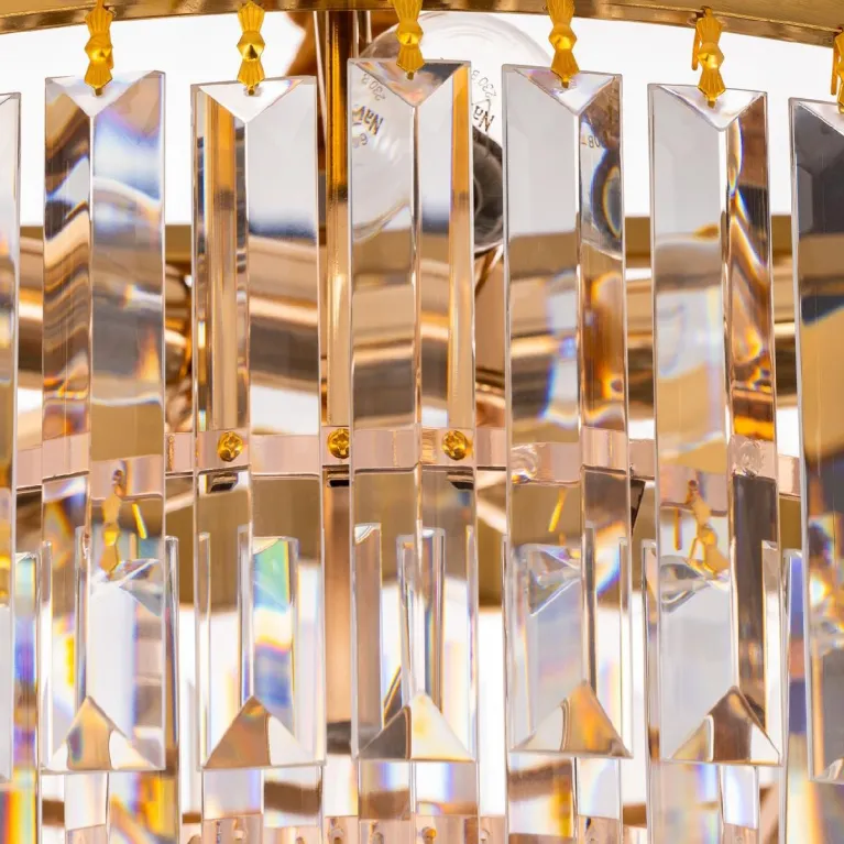 Преобладающий цвет плафонов: Прозрачный, арматуры: Золото; материал изготовления арматуры: Металл, размеры, мм: / высота 850 / диаметр 410. Общая мощность – 360 Ватт, а максимальная площадь освещения до 21 м2. Основной тип ламп, предусмотренный производителем: Накаливания с цоколем E14. В зависимости от предпочтений можно использовать лампы теплового, холодного или нейтрального света, за исключением люстр с типом цоколя LED.