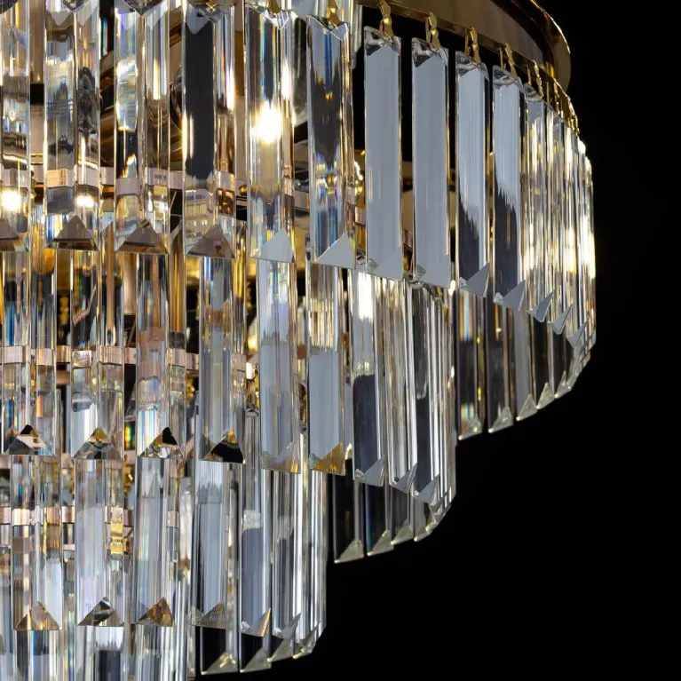 Преобладающий цвет плафонов: Прозрачный, арматуры: Золото; материал изготовления арматуры: Металл, размеры, мм: / высота 1050 / диаметр 510. Общая мощность – 660 Ватт, а максимальная площадь освещения до 30 м2. Основной тип ламп, предусмотренный производителем: Накаливания с цоколем E14. В зависимости от предпочтений можно использовать лампы теплового, холодного или нейтрального света, за исключением люстр с типом цоколя LED.