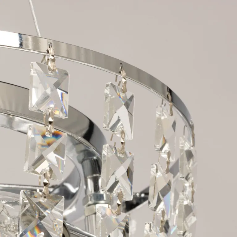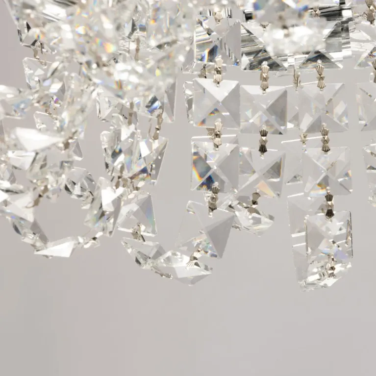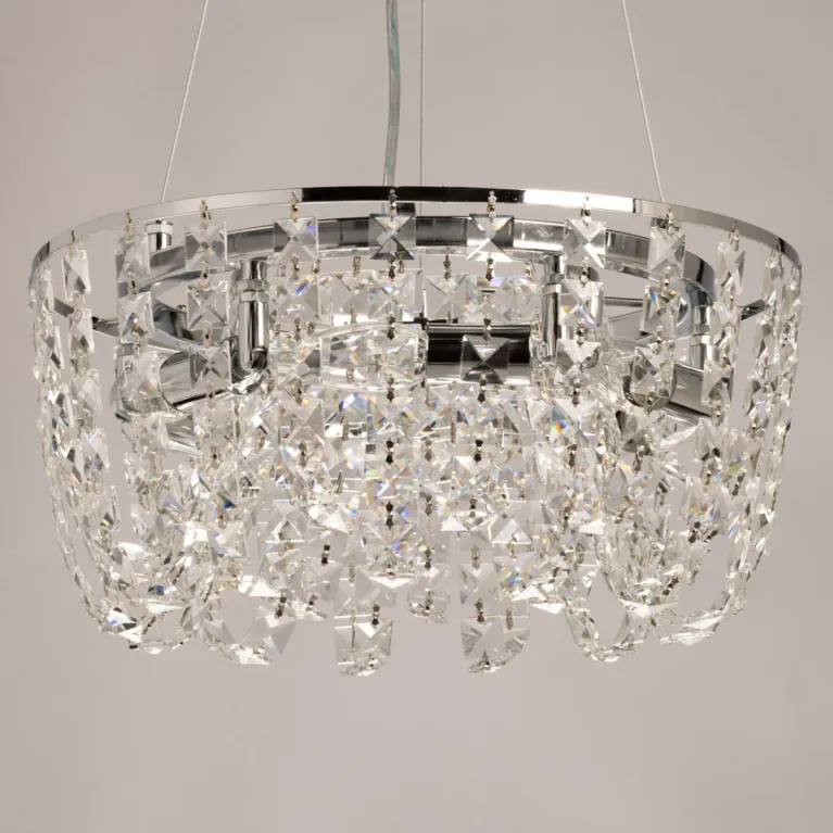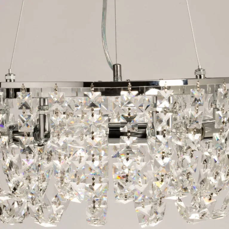 Преобладающий цвет плафонов: Прозрачный, арматуры: Хром; материал изготовления арматуры: Металл, размеры, мм: длина 400 / ширина 400 / высота 800 Общая мощность – 240 Ватт, а максимальная площадь освещения до 12 м2. Основной тип ламп, предусмотренный производителем: Накаливания с цоколем E14. В зависимости от предпочтений можно использовать лампы теплового, холодного или нейтрального света, за исключением люстр с типом цоколя LED.