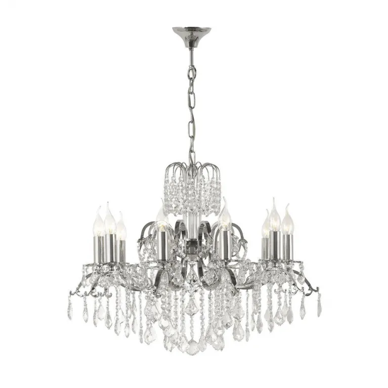 Корпус люстры выполнен из прочного металла и имеет стильное никелевое покрытие, придающее изделию современный вид. Изящные хрустальные подвески добавляют утонченности и роскоши, создавая неповторимую атмосферу в помещении.