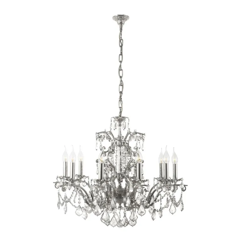 Корпус люстры выполнен из высококачественного металла и имеет стильное хромированное покрытие, придающее изделию современный и элегантный вид. Плафоны изготовлены из прочного и долговечного хрусталя, который придает свету неповторимое преломление и мерцание.