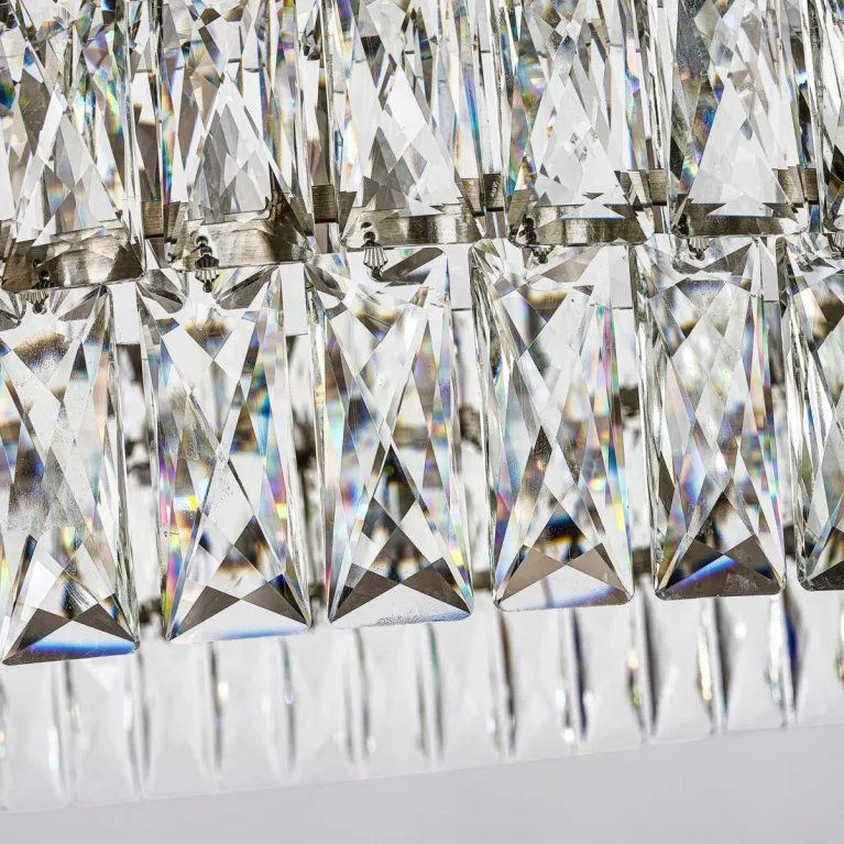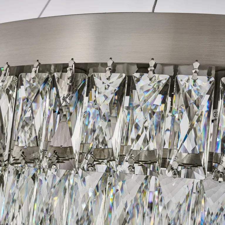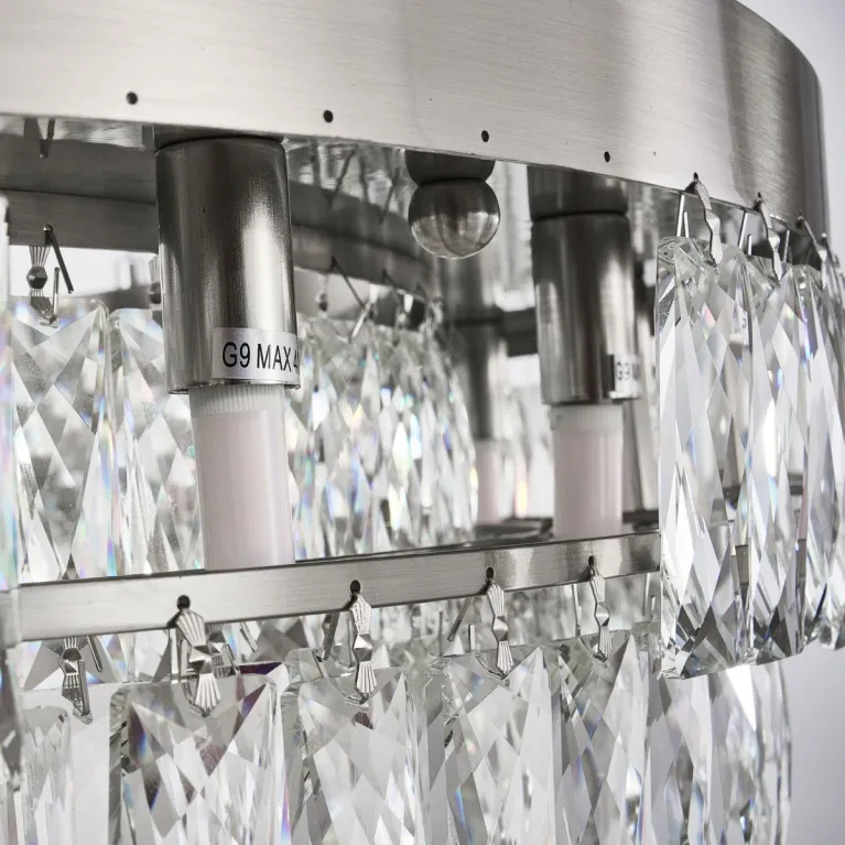 Преобладающий цвет плафонов: Прозрачный, арматуры: Никель; материал изготовления арматуры: Металл, размеры, мм: / высота 1760 / диаметр 800. Общая мощность – 640 Ватт, а максимальная площадь освещения до 48 м2. Основной тип ламп, предусмотренный производителем: Галогеновая с цоколем G9. В зависимости от предпочтений можно использовать лампы теплового, холодного или нейтрального света, за исключением люстр с типом цоколя LED.