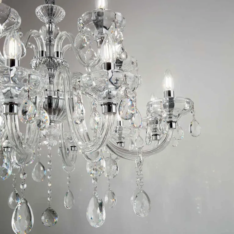 Изготовленная из прочного металла и высококачественного хрусталя, люстра имеет изысканный и утонченный внешний вид. Ее длинные тонкие подвески придают ей легкость и изящество, делая её центральным элементом любого интерьера.