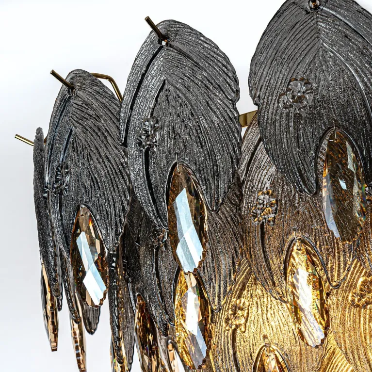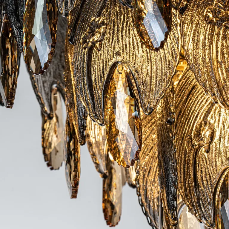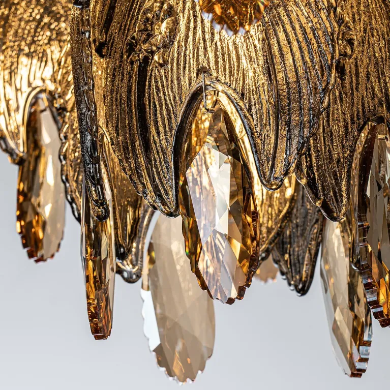 Преобладающий цвет плафонов: Дымчатый, арматуры: Латунь; материал изготовления арматуры: Металл, размеры, мм: / высота 800 / диаметр 515. Общая мощность – 360 Ватт. Основной тип ламп, предусмотренный производителем: Накаливания с цоколем E14. В зависимости от предпочтений можно использовать лампы теплового, холодного или нейтрального света, за исключением люстр с типом цоколя LED.