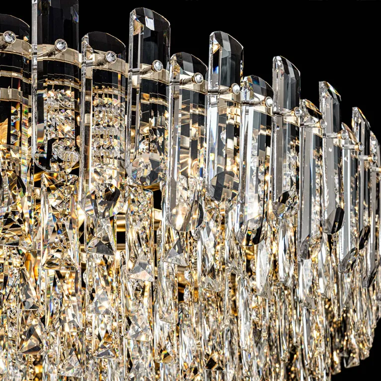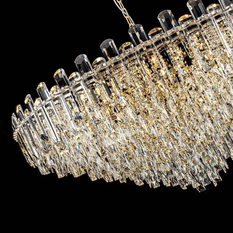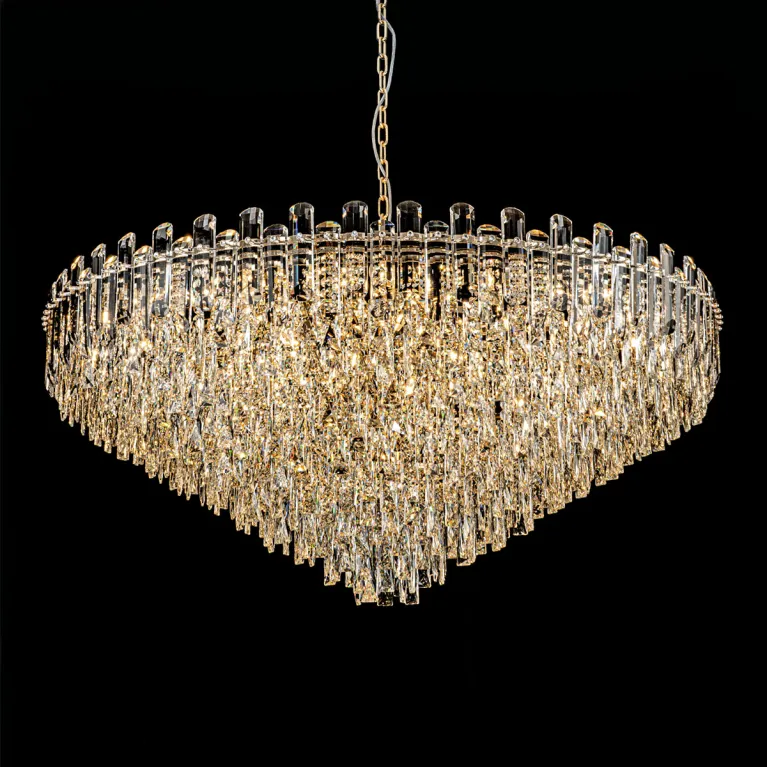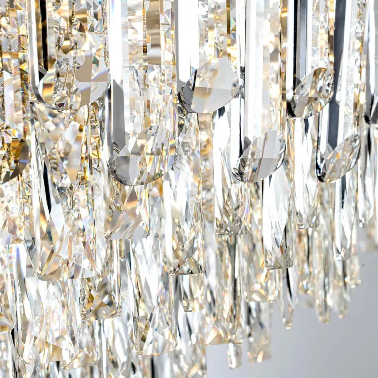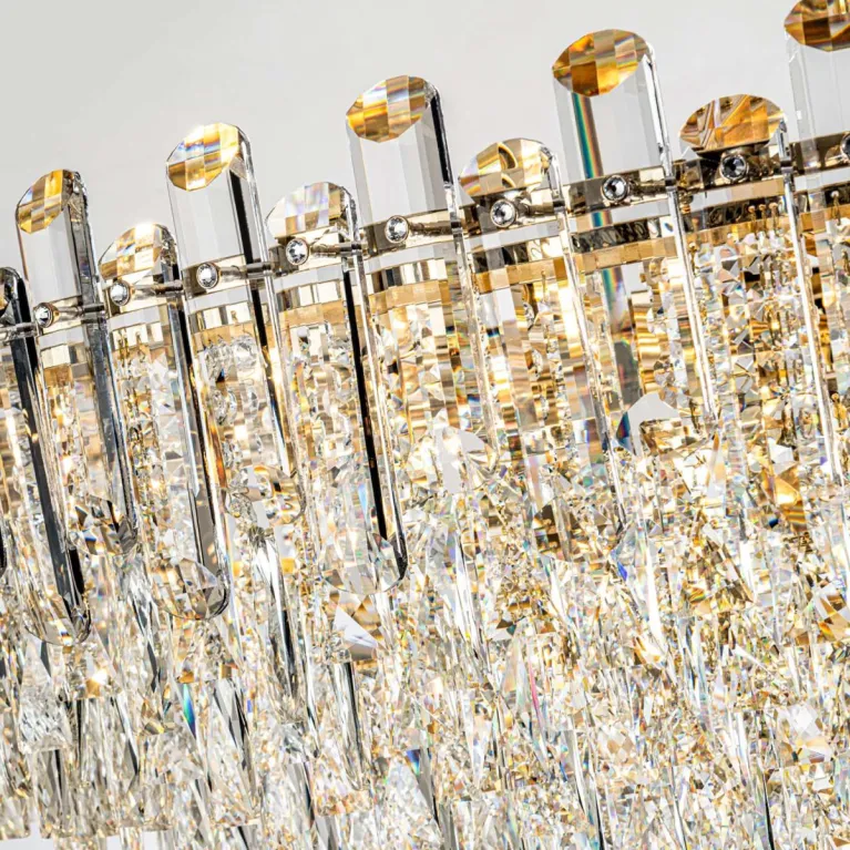 Преобладающий цвет плафонов: Прозрачный, арматуры: Золото; материал изготовления арматуры: Металл, размеры, мм: / высота 1160 / диаметр 1200. Общая мощность – 1280 Ватт, а максимальная площадь освещения до 20 м2. Основной тип ламп, предусмотренный производителем: Накаливания с цоколем E14. В зависимости от предпочтений можно использовать лампы теплового, холодного или нейтрального света, за исключением люстр с типом цоколя LED.