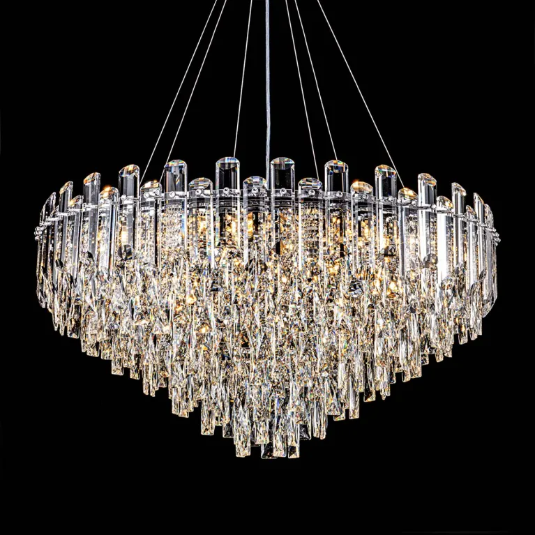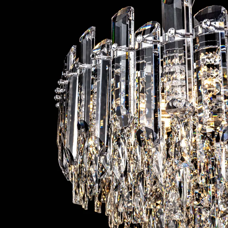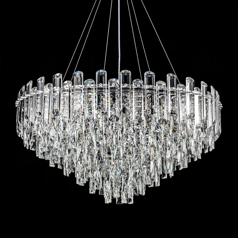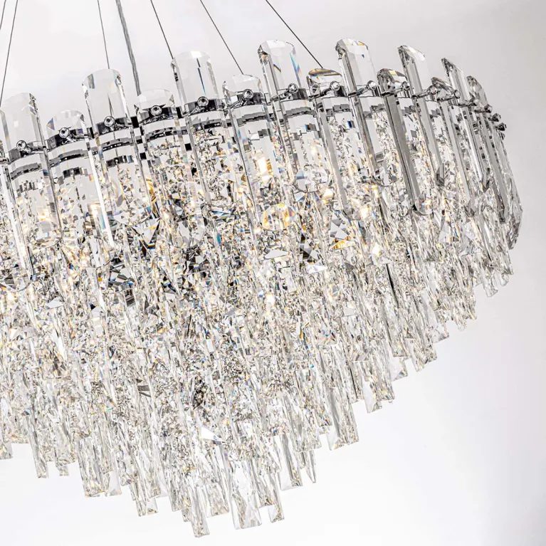 Преобладающий цвет плафонов: Прозрачный, арматуры: Хром; материал изготовления арматуры: Металл, размеры, мм: / высота 1370 / диаметр 800. Общая мощность – 720 Ватт, а максимальная площадь освещения до 20 м2. Основной тип ламп, предусмотренный производителем: Накаливания с цоколем E14. В зависимости от предпочтений можно использовать лампы теплового, холодного или нейтрального света, за исключением люстр с типом цоколя LED.