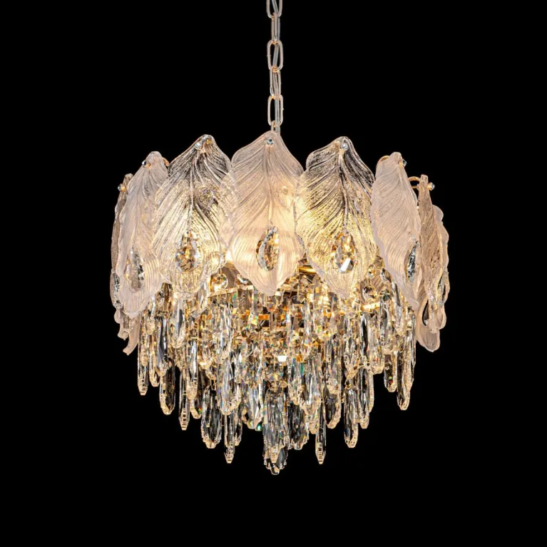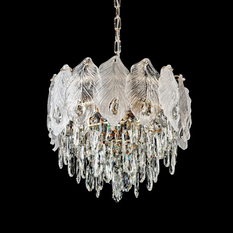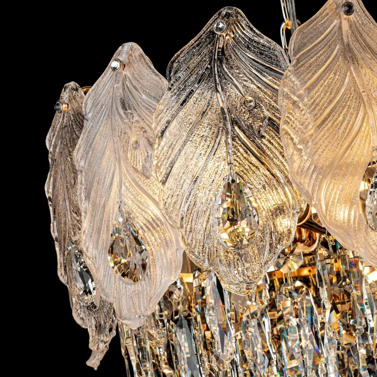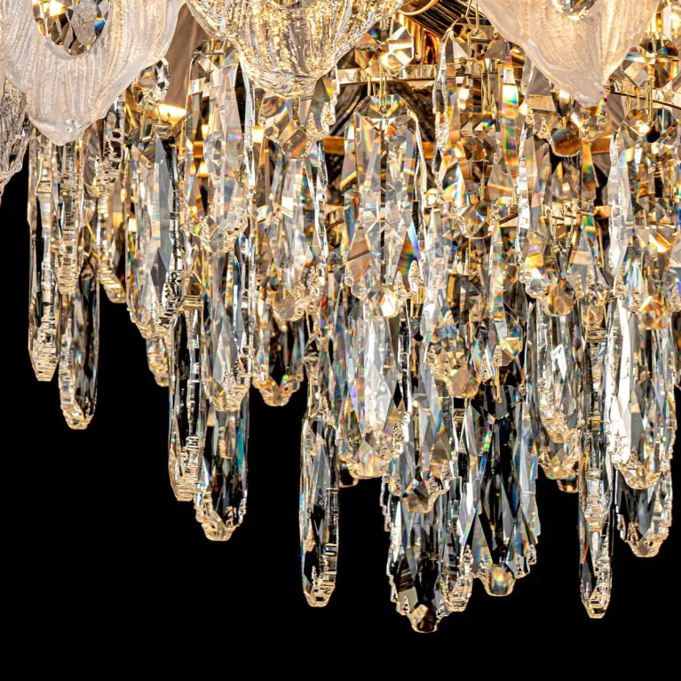 Преобладающий цвет плафонов: Прозрачный, арматуры: Золото; материал изготовления арматуры: Металл, размеры, мм: / высота 1000 / диаметр 400. Общая мощность – 320 Ватт, а максимальная площадь освещения до 15 м2. Основной тип ламп, предусмотренный производителем: Накаливания с цоколем E14. В зависимости от предпочтений можно использовать лампы теплового, холодного или нейтрального света, за исключением люстр с типом цоколя LED.