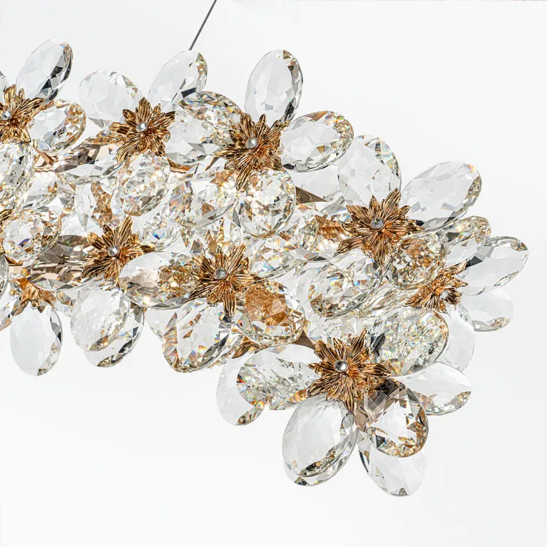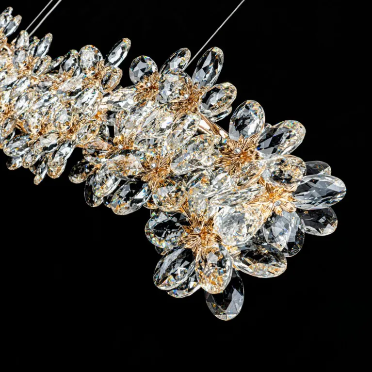 Преобладающий цвет плафонов: Прозрачный, арматуры: Золото; материал изготовления арматуры: Металл, размеры, мм: длина 1200 / ширина 120 / высота 1900 Общая мощность – 50 Ватт, а максимальная площадь освещения до 20 м2. Основной тип ламп, предусмотренный производителем: Светодиодная с цоколем LED. В зависимости от предпочтений можно использовать лампы теплового, холодного или нейтрального света, за исключением люстр с типом цоколя LED.