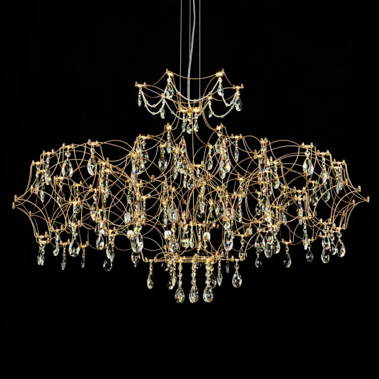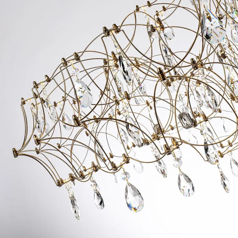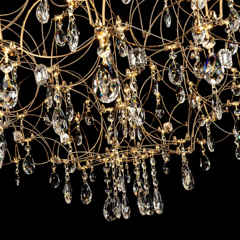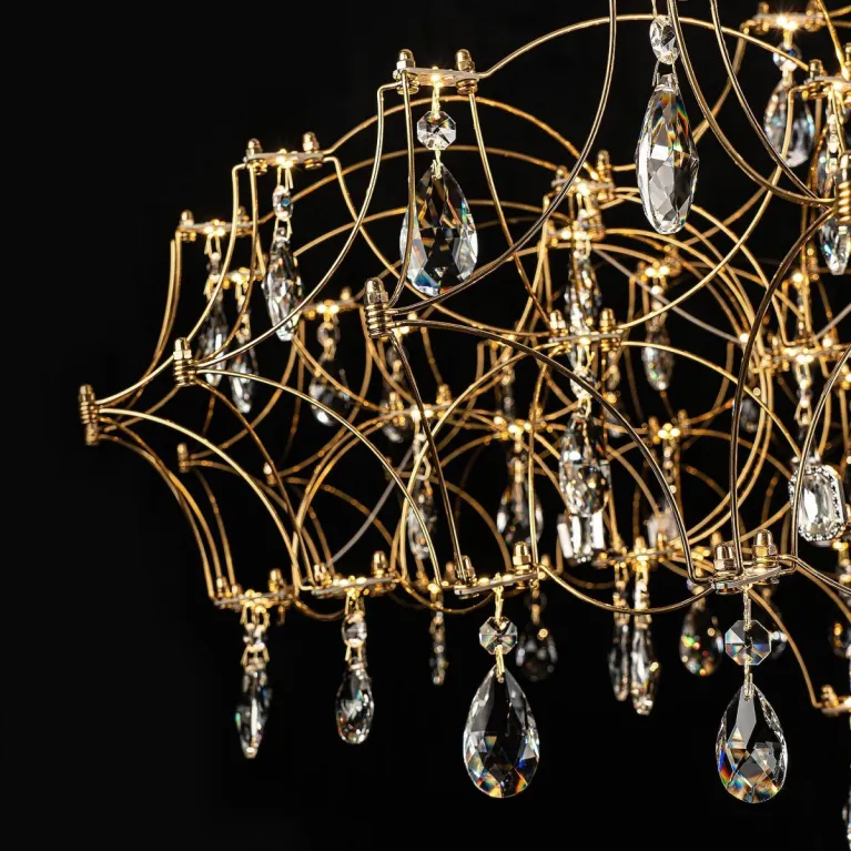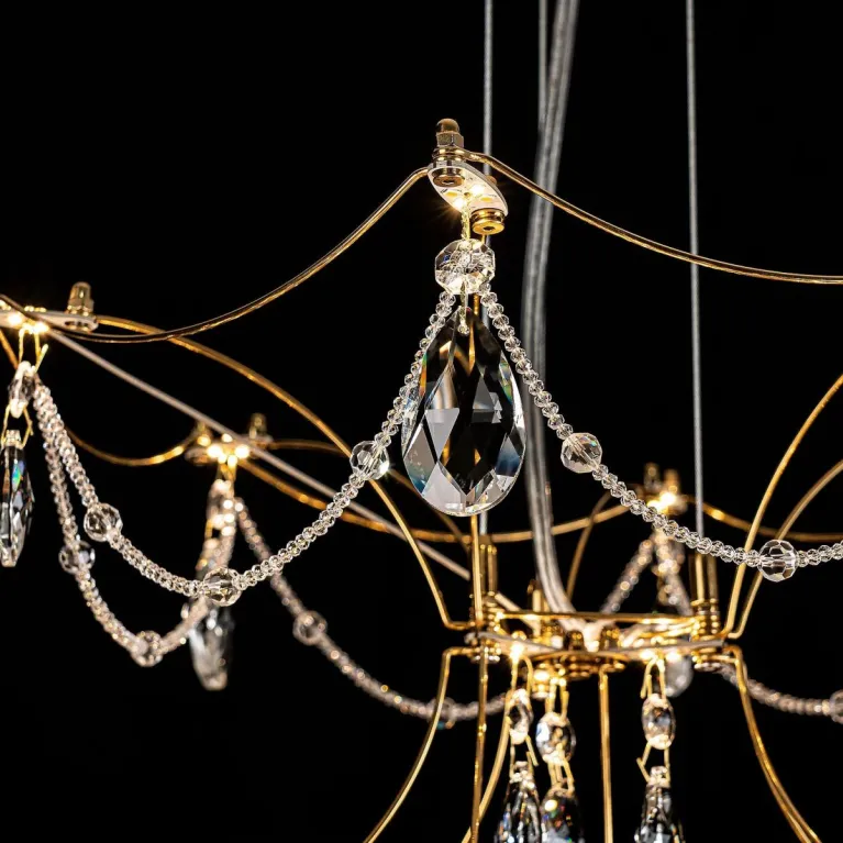Преобладающий цвет плафонов: Прозрачный, арматуры: Золото; материал изготовления арматуры: Металл, размеры, мм: / высота 2610 / диаметр 1050. Общая мощность – 80 Ватт, а максимальная площадь освещения до 20 м2. Основной тип ламп, предусмотренный производителем: Светодиодная с цоколем LED. В зависимости от предпочтений можно использовать лампы теплового, холодного или нейтрального света, за исключением люстр с типом цоколя LED.