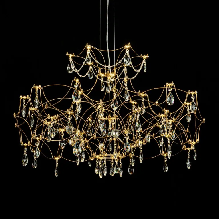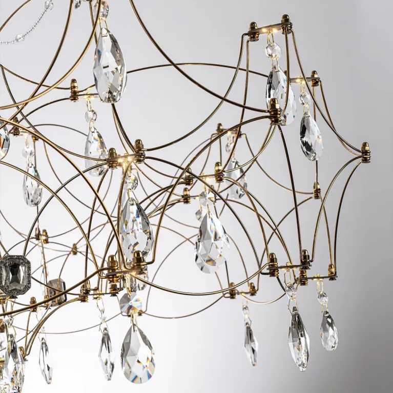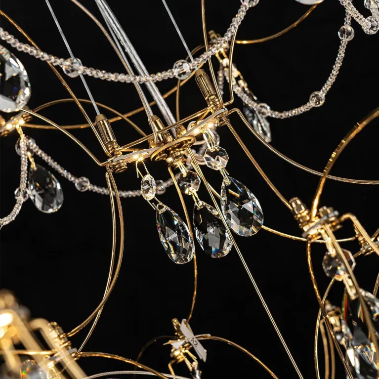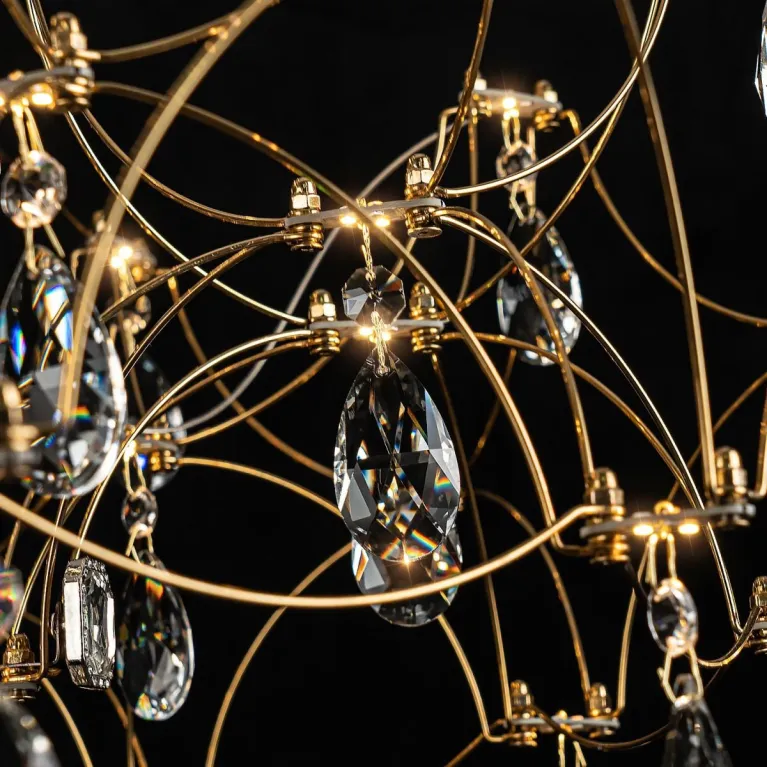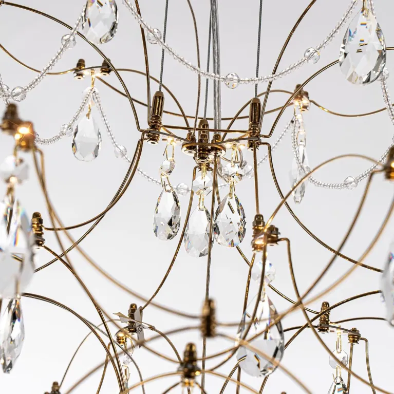 Преобладающий цвет плафонов: Прозрачный, арматуры: Золото; материал изготовления арматуры: Металл, размеры, мм: / высота 2400 / диаметр 770. Общая мощность – 45 Ватт, а максимальная площадь освещения до 17 м2. Основной тип ламп, предусмотренный производителем: Светодиодная с цоколем LED. В зависимости от предпочтений можно использовать лампы теплового, холодного или нейтрального света, за исключением люстр с типом цоколя LED.