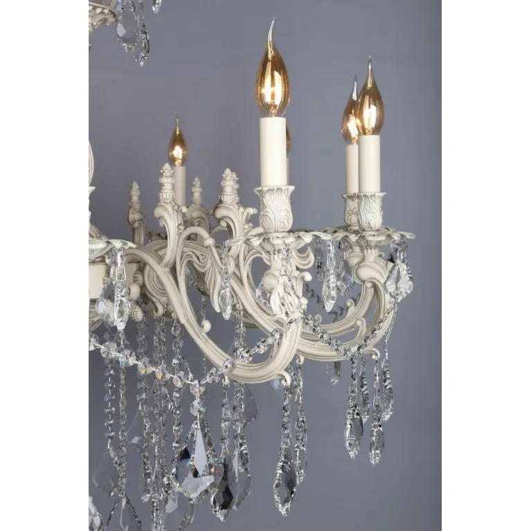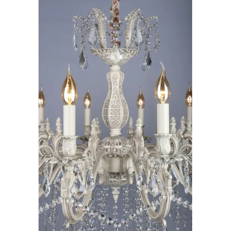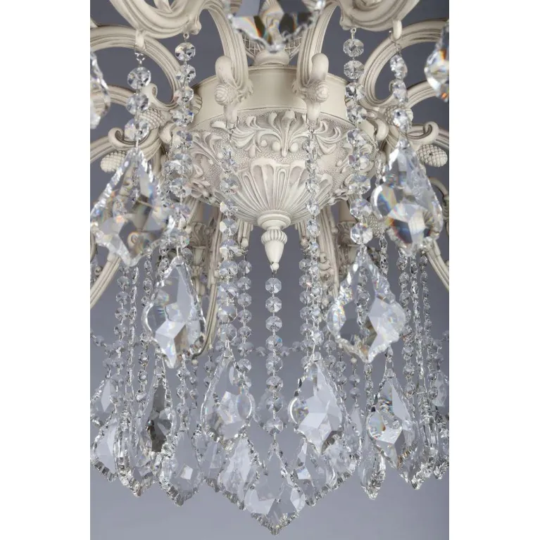 Основание люстры выполнено из качественного металла, что гарантирует её долговечность и надежность. Хрустальные подвески придают светильнику неповторимый блеск и утонченность, делая его центральным элементом интерьера.