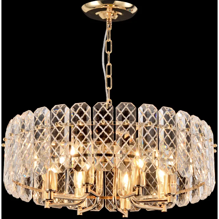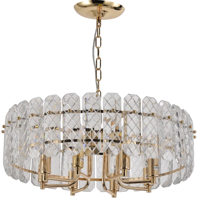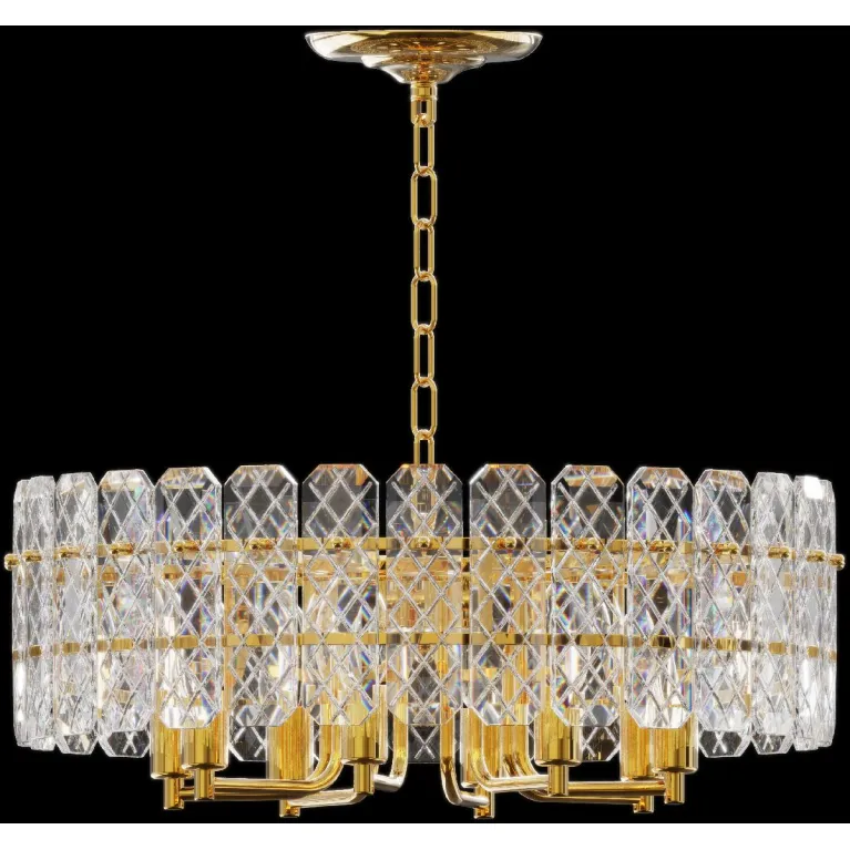 Преобладающий цвет плафонов: Прозрачный, арматуры: Золото; материал изготовления арматуры: Металл, размеры, мм: / высота 490 / диаметр 530. Общая мощность – 320 Ватт, а максимальная площадь освещения до 24 м2. Основной тип ламп, предусмотренный производителем: Накаливания с цоколем E14. В зависимости от предпочтений можно использовать лампы теплового, холодного или нейтрального света, за исключением люстр с типом цоколя LED.