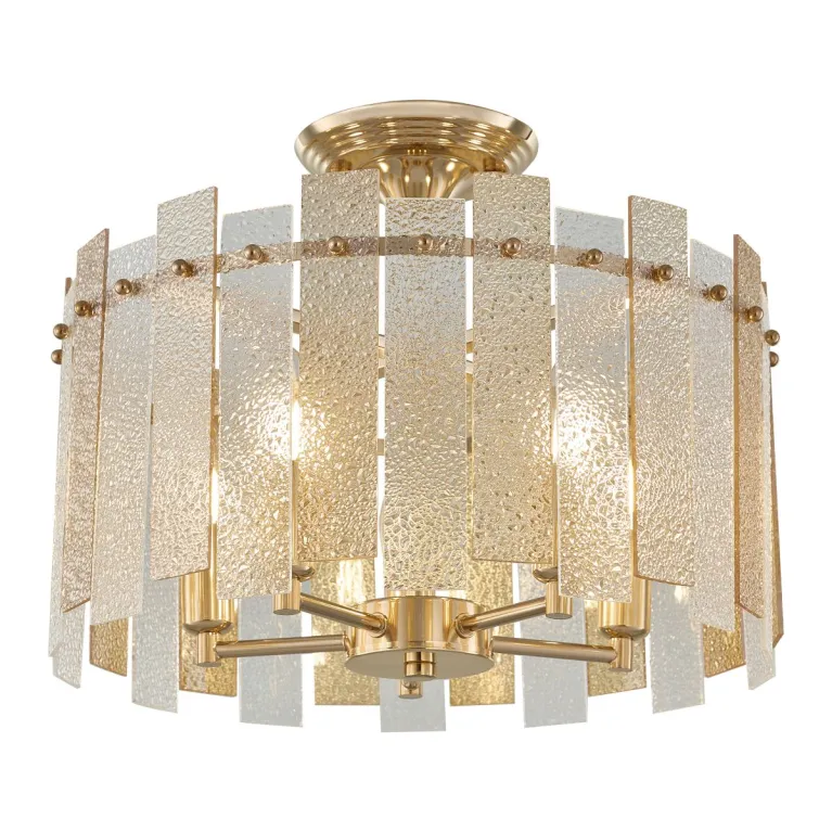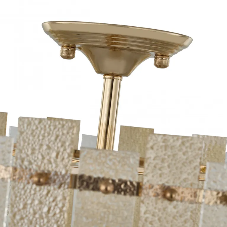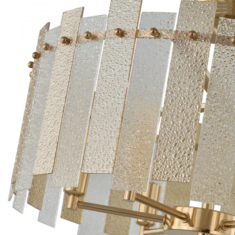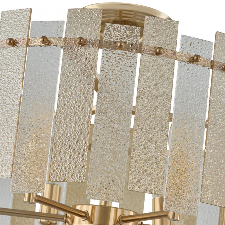 Преобладающий цвет плафонов: Янтарный, арматуры: Золото; материал изготовления арматуры: Металл, размеры, мм: / высота 310 / диаметр 390. Общая мощность – 200 Ватт. Основной тип ламп, предусмотренный производителем: Накаливания с цоколем E14. В зависимости от предпочтений можно использовать лампы теплового, холодного или нейтрального света, за исключением люстр с типом цоколя LED.