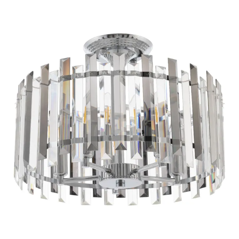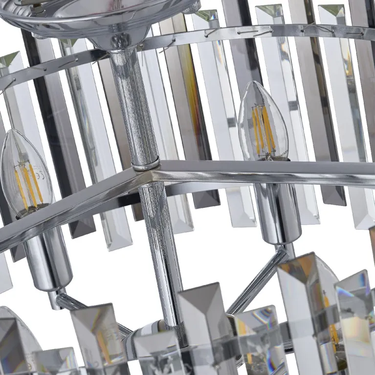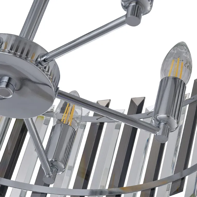 Преобладающий цвет плафонов: Дымчатый, арматуры: Хром; материал изготовления арматуры: Металл, размеры, мм: / высота 300 / диаметр 390. Общая мощность – 200 Ватт. Основной тип ламп, предусмотренный производителем: Накаливания с цоколем E14. В зависимости от предпочтений можно использовать лампы теплового, холодного или нейтрального света, за исключением люстр с типом цоколя LED.