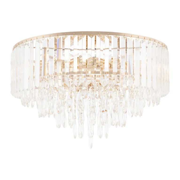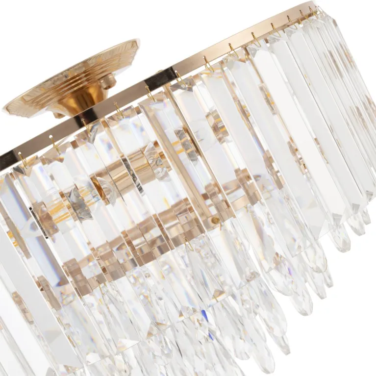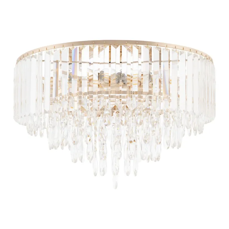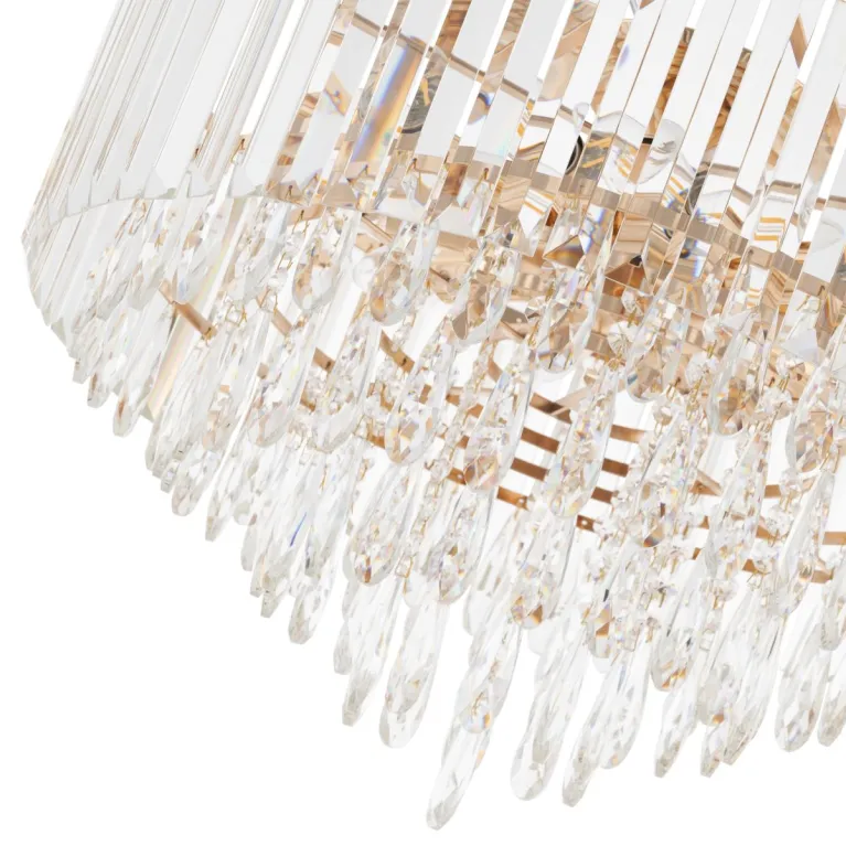 Преобладающий цвет плафонов: Прозрачный, арматуры: Золото; материал изготовления арматуры: Металл, размеры, мм: / высота 400 / диаметр 570. Общая мощность – 400 Ватт. Основной тип ламп, предусмотренный производителем: Накаливания с цоколем E14. В зависимости от предпочтений можно использовать лампы теплового, холодного или нейтрального света, за исключением люстр с типом цоколя LED.
