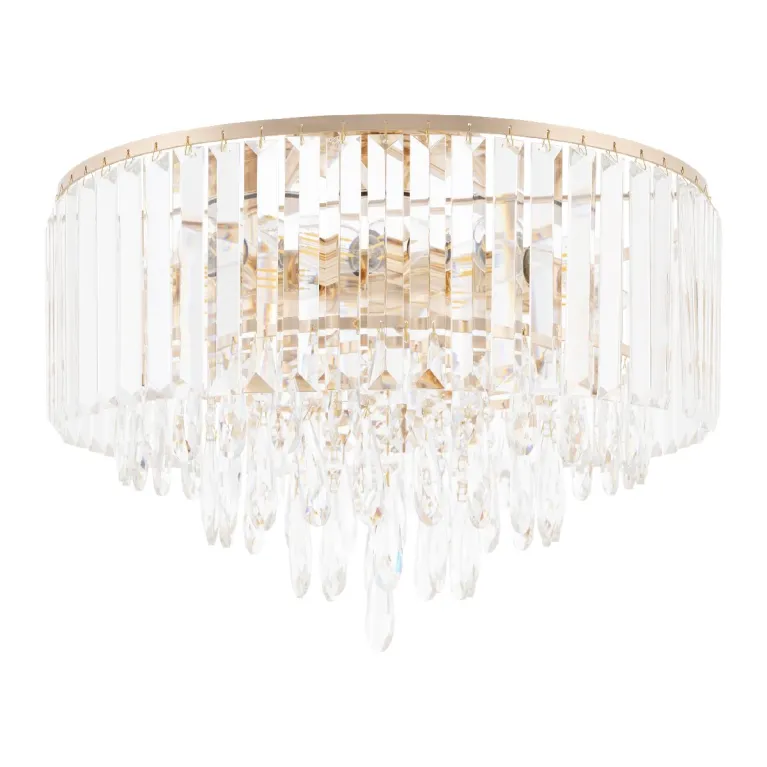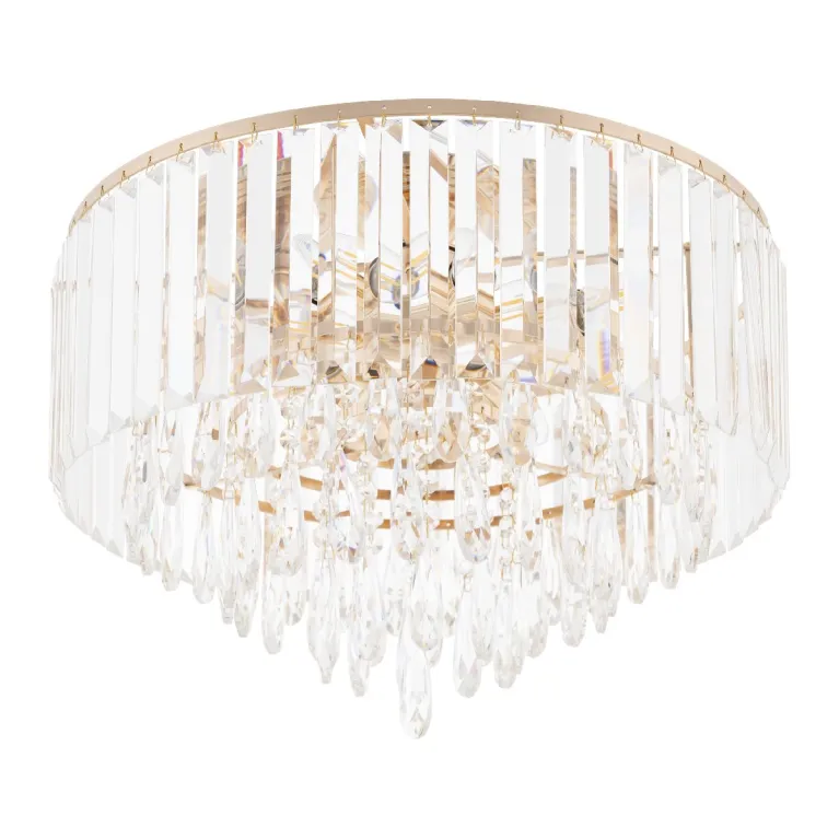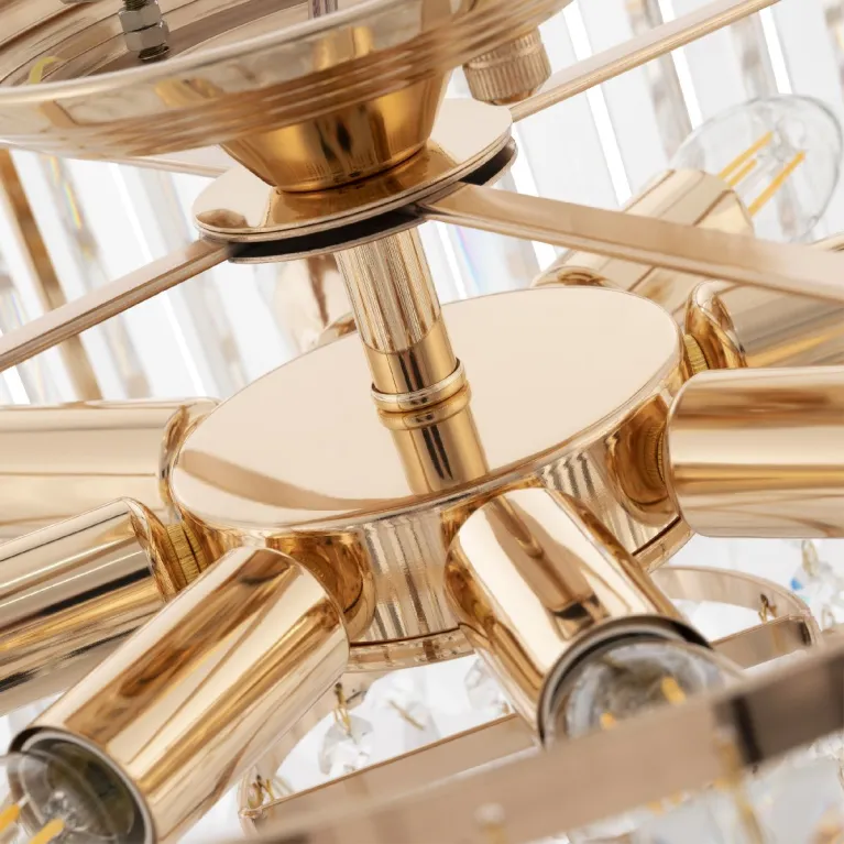 Преобладающий цвет плафонов: Прозрачный, арматуры: Золото; материал изготовления арматуры: Металл, размеры, мм: / высота 360 / диаметр 470. Общая мощность – 320 Ватт. Основной тип ламп, предусмотренный производителем: Накаливания с цоколем E14. В зависимости от предпочтений можно использовать лампы теплового, холодного или нейтрального света, за исключением люстр с типом цоколя LED.