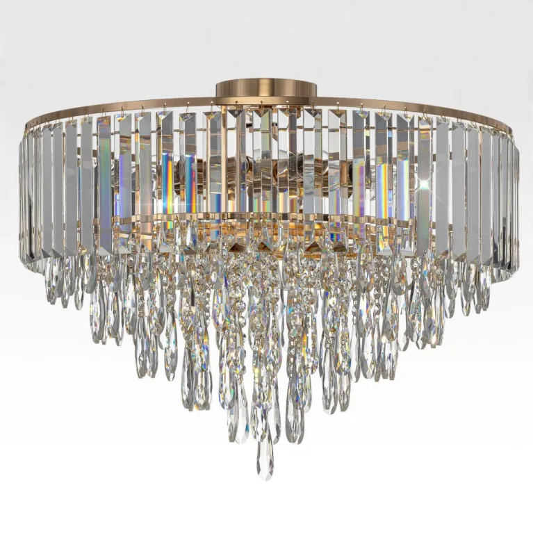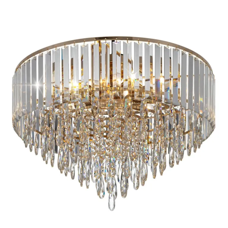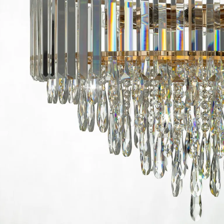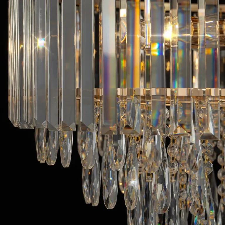 Преобладающий цвет плафонов: Прозрачный, арматуры: Золото; материал изготовления арматуры: Металл, размеры, мм: / высота 440 / диаметр 590. Общая мощность – 400 Ватт. Основной тип ламп, предусмотренный производителем: Накаливания с цоколем E14. В зависимости от предпочтений можно использовать лампы теплового, холодного или нейтрального света, за исключением люстр с типом цоколя LED.