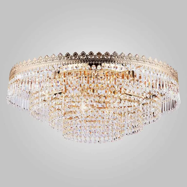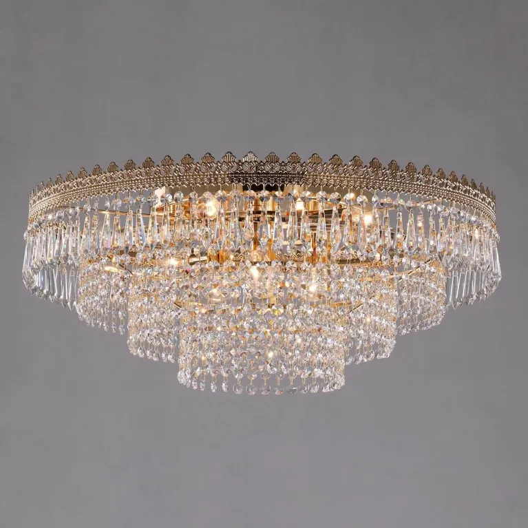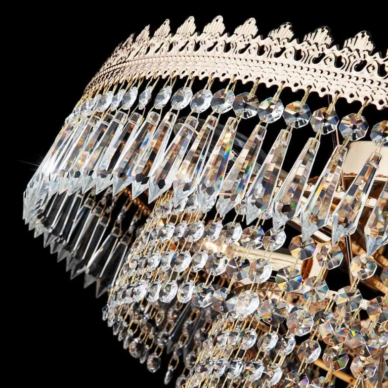 Люстра оснащена десятью лампами типа E14, что обеспечивает яркое и равномерное освещение. Основание выполнено из прочного металла с золотым покрытием, которое придает изделию роскошный и утонченный вид. Прозрачный хрусталь строцки добавляет люстрам особой изящества и блеска, делая их настоящими произведениями искусства.