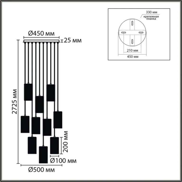 Преобладающий цвет плафонов: Разноцветный, арматуры: Черный; материал изготовления арматуры: Металл, размеры, мм: длина 500 / ширина 500 / высота 2725 Общая мощность – 400 Ватт, а максимальная площадь освещения до 20 м2. Основной тип ламп, предусмотренный производителем: Накаливания с цоколем E14. В зависимости от предпочтений можно использовать лампы теплового, холодного или нейтрального света, за исключением люстр с типом цоколя LED.