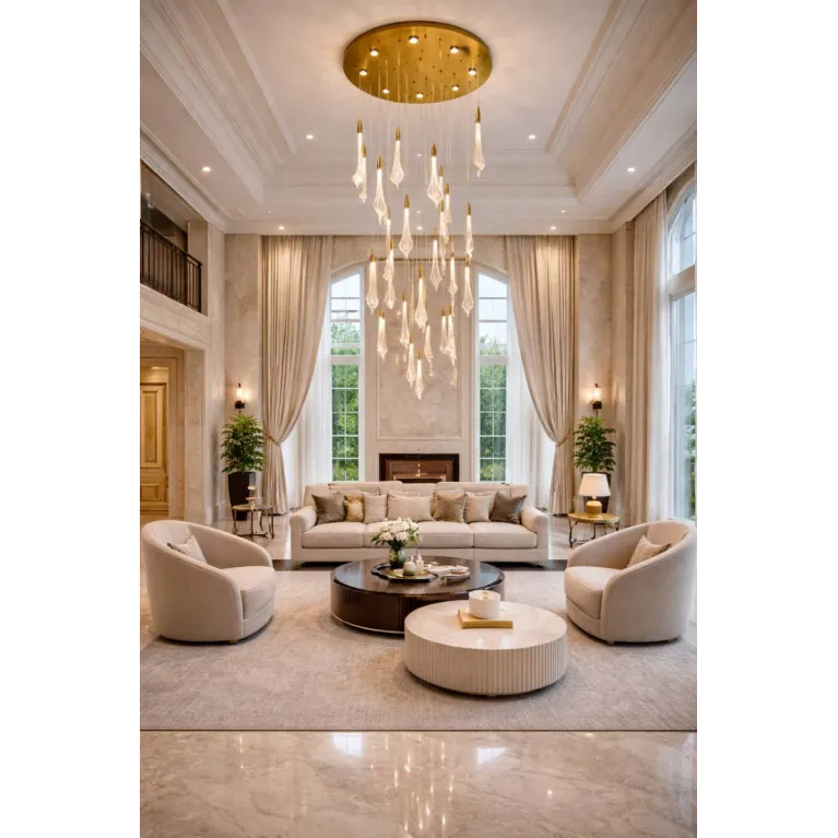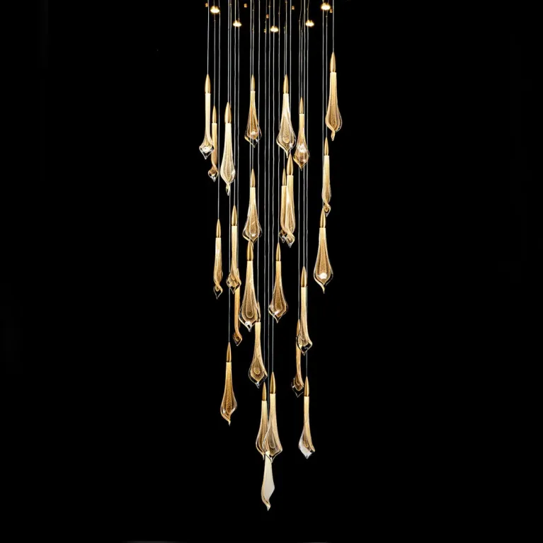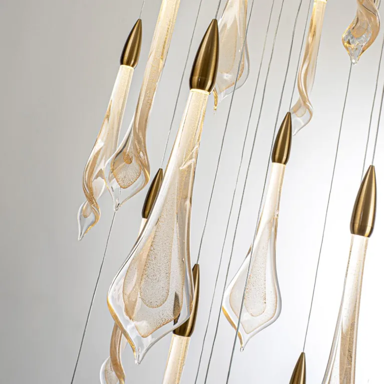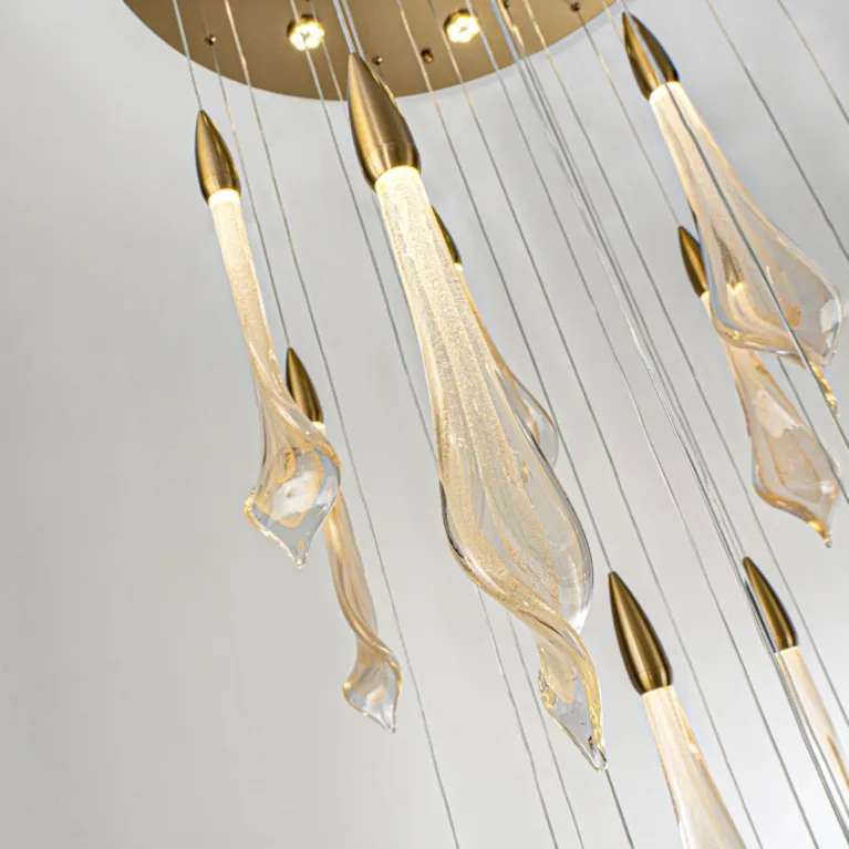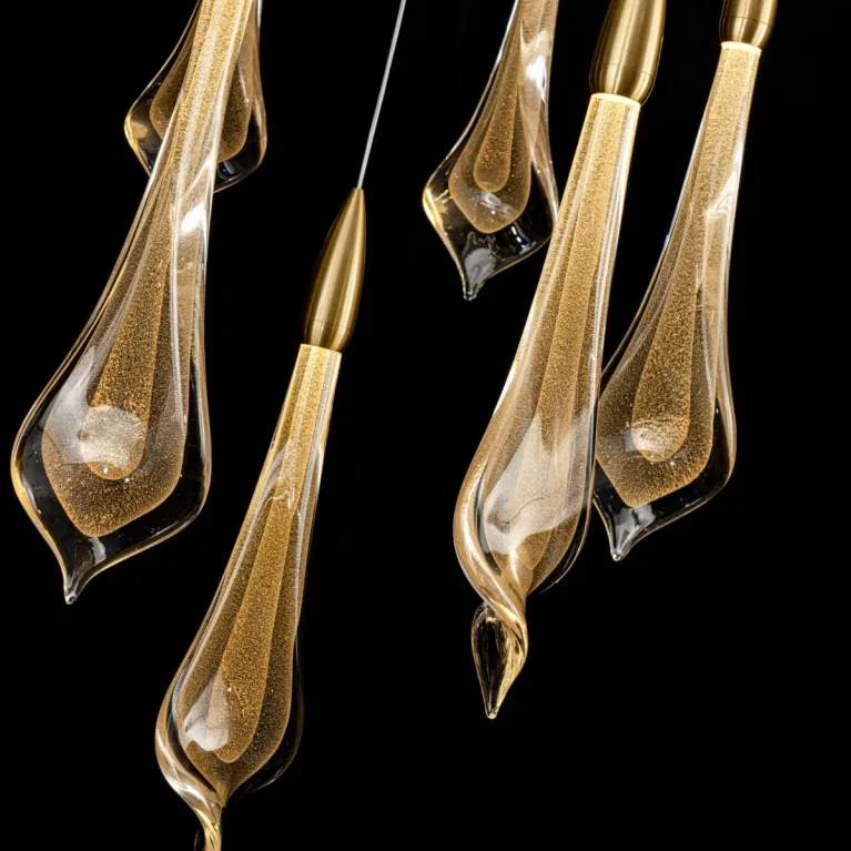 Преобладающий цвет плафонов: Золото, арматуры: Латунь; материал изготовления арматуры: Металл, размеры, мм: / высота 3000 / диаметр 800. Общая мощность – 104 Ватт. Основной тип ламп, предусмотренный производителем: Светодиодная с цоколем LED. В зависимости от предпочтений можно использовать лампы теплового, холодного или нейтрального света, за исключением люстр с типом цоколя LED.