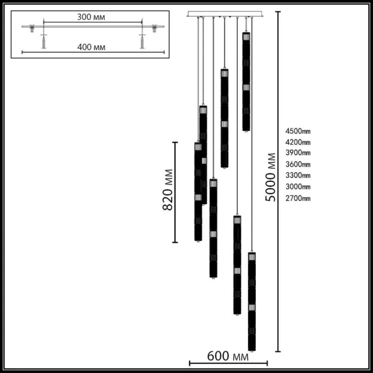 Преобладающий цвет плафонов: Прозрачный, арматуры: Бронза; материал изготовления арматуры: Металл, размеры, мм: / высота 5000 / диаметр 600. Общая мощность – 210 Ватт, а максимальная площадь освещения до 85 м2. Основной тип ламп, предусмотренный производителем: Светодиодная с цоколем LED. В зависимости от предпочтений можно использовать лампы теплового, холодного или нейтрального света, за исключением люстр с типом цоколя LED.