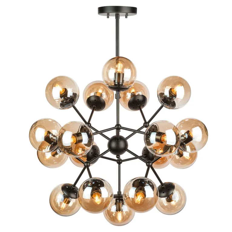 Преобладающий цвет плафонов: Янтарный, арматуры: Черный; материал изготовления арматуры: Алюминий, размеры, мм: / высота 1500 / диаметр 700. Общая мощность – 1080 Ватт, а максимальная площадь освещения до 54 м2. Основной тип ламп, предусмотренный производителем: Накаливания с цоколем E27. В зависимости от предпочтений можно использовать лампы теплового, холодного или нейтрального света, за исключением люстр с типом цоколя LED.