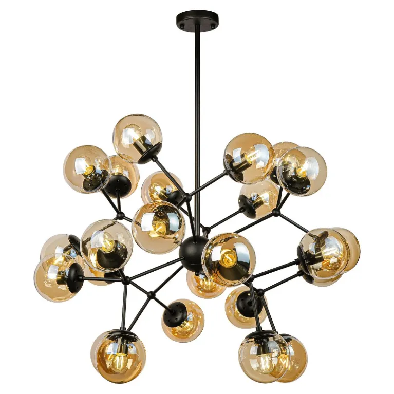 Преобладающий цвет плафонов: Янтарный, арматуры: Черный; материал изготовления арматуры: Алюминий, размеры, мм: / высота 1300 / диаметр 800. Общая мощность – 1440 Ватт, а максимальная площадь освещения до 72 м2. Основной тип ламп, предусмотренный производителем: Накаливания с цоколем E27. В зависимости от предпочтений можно использовать лампы теплового, холодного или нейтрального света, за исключением люстр с типом цоколя LED.