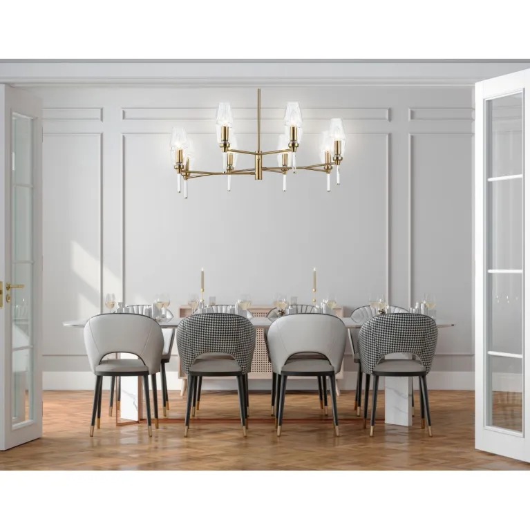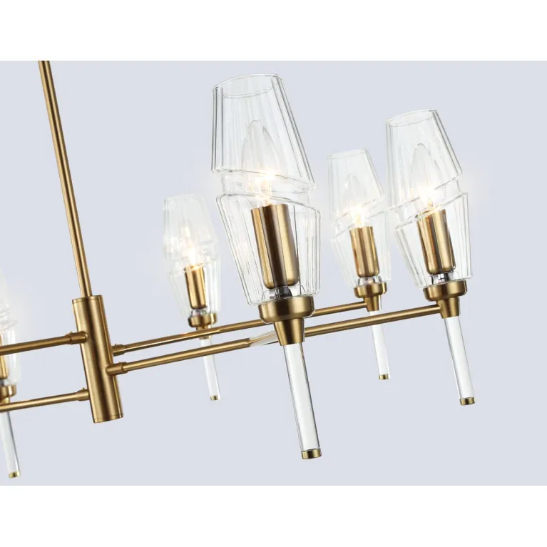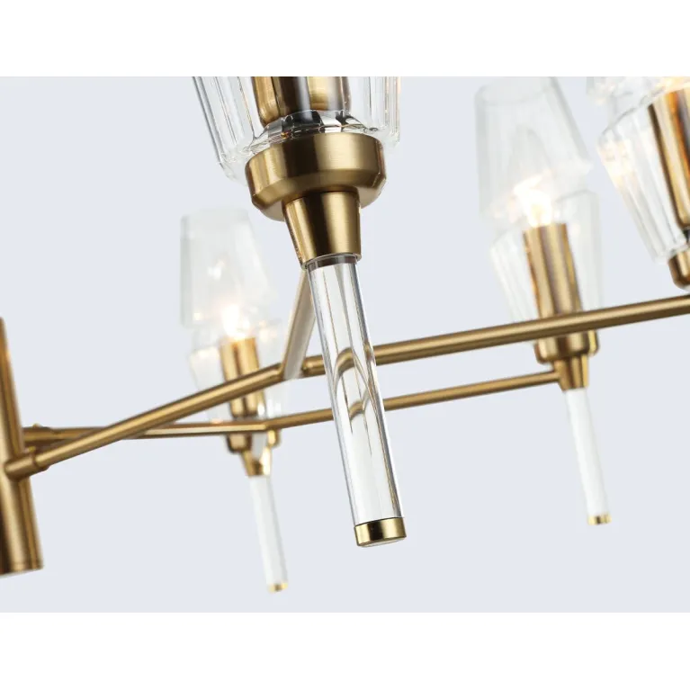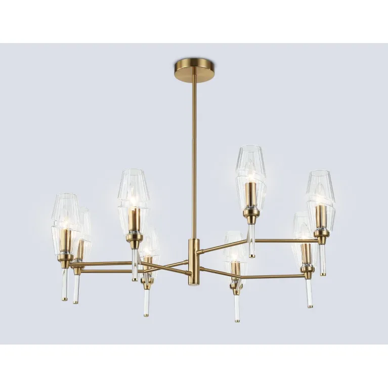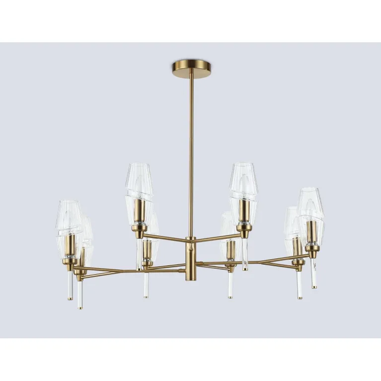 Преобладающий цвет плафонов: Прозрачный, арматуры: Латунь; материал изготовления арматуры: Металл, размеры, мм: / высота 720 / диаметр 800. Общая мощность – 320 Ватт, а максимальная площадь освещения до 25 м2. Основной тип ламп, предусмотренный производителем: Накаливания с цоколем E14. В зависимости от предпочтений можно использовать лампы теплового, холодного или нейтрального света, за исключением люстр с типом цоколя LED.